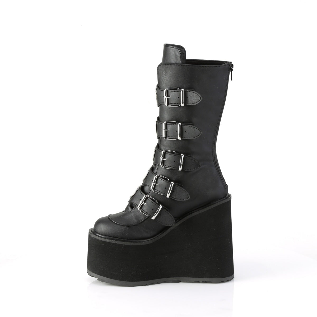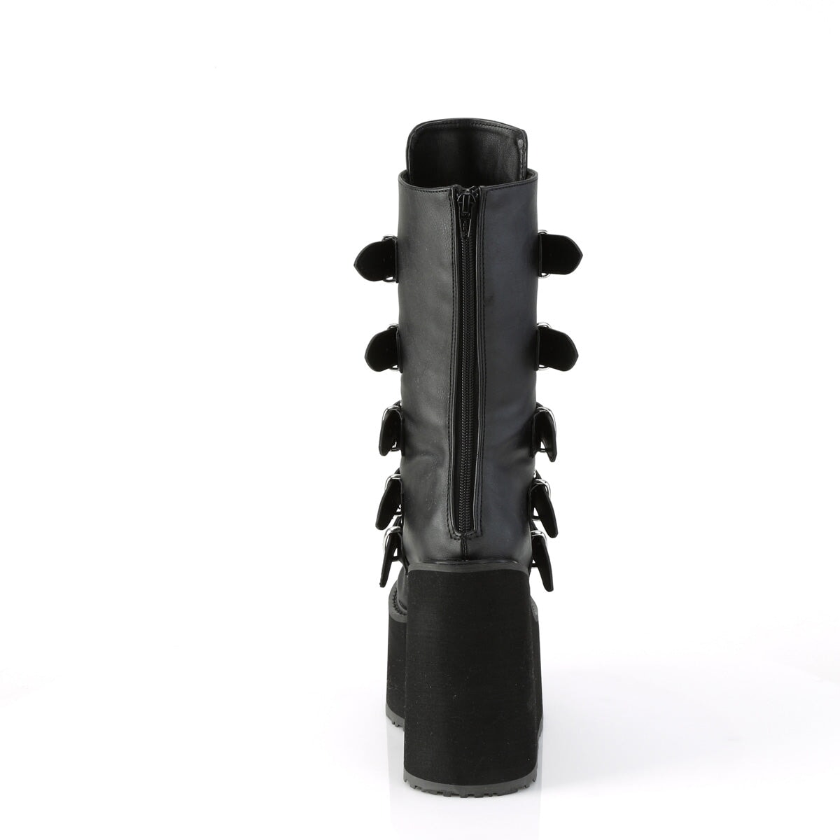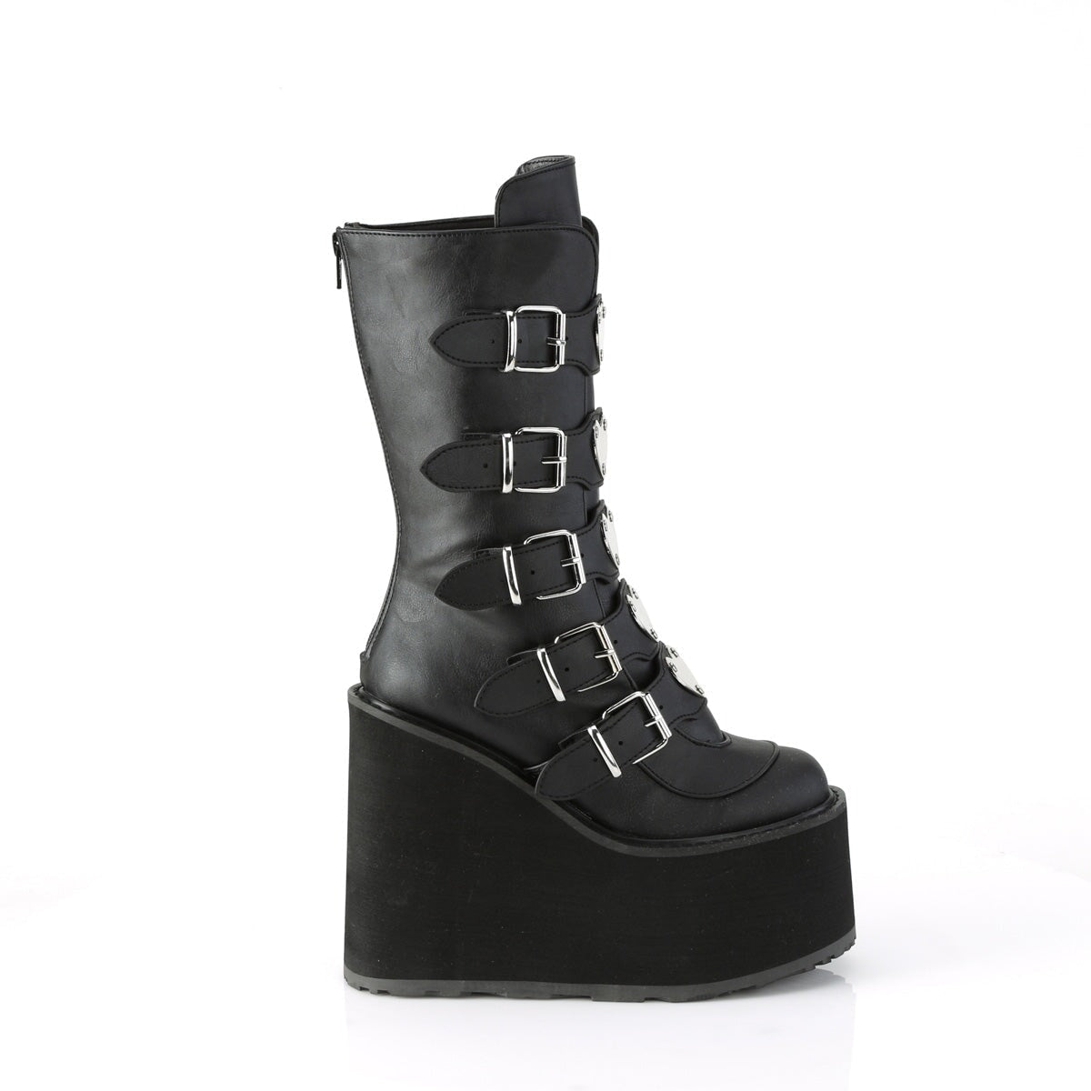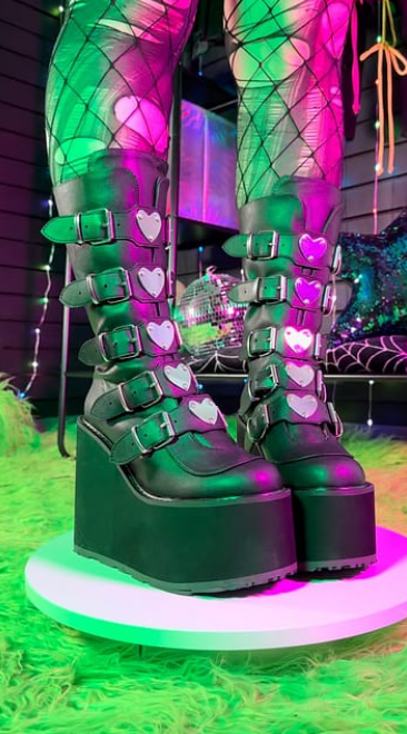 Portez votre cœur sur vos bottes! Botte à plateforme mi-mollet de 5 1/2 po (140 mm) avec 5 sangles à boucle avec plaques métalliques en forme de cœur au centre, fermeture à glissière en métal à l’arrière pour un port facile et un emplacement.