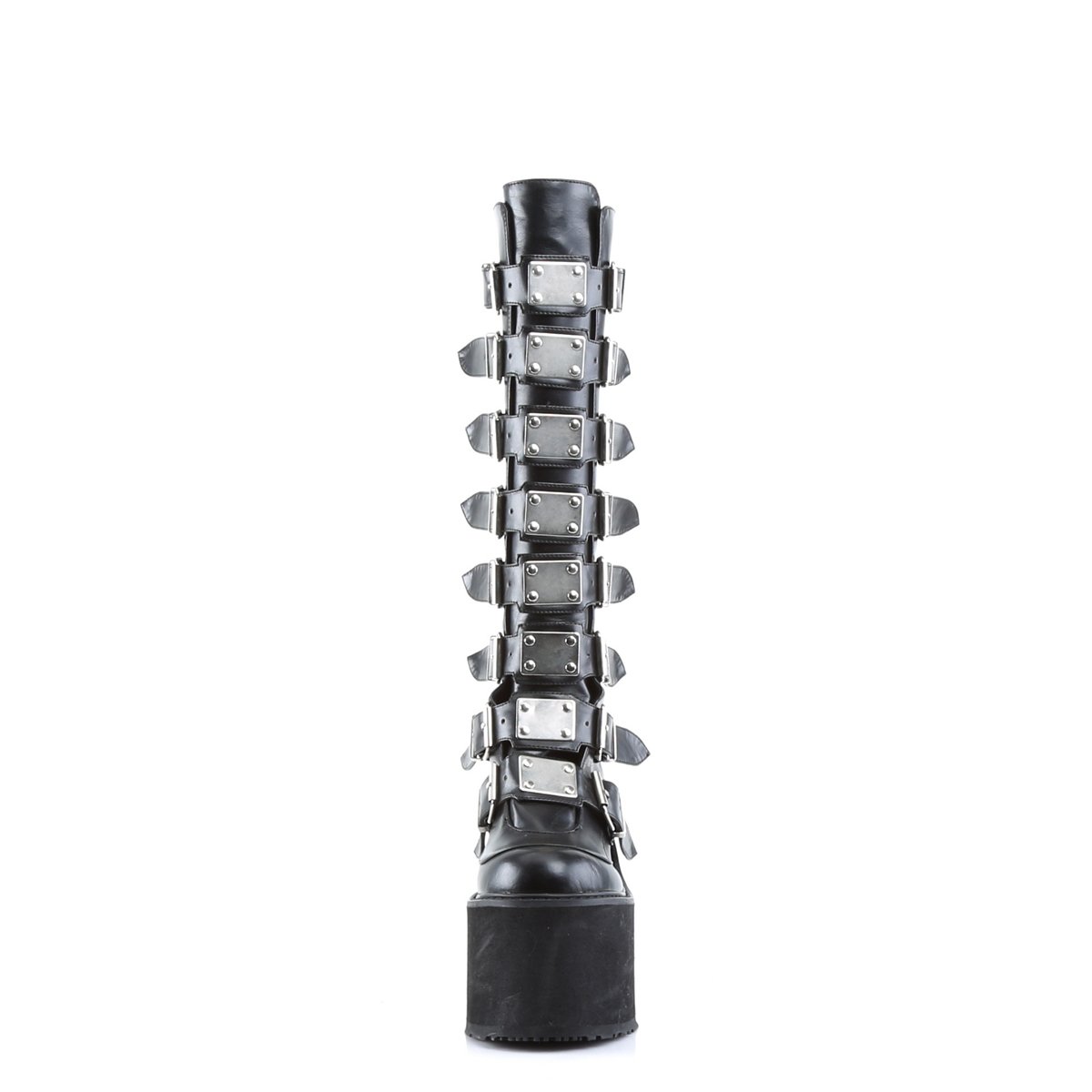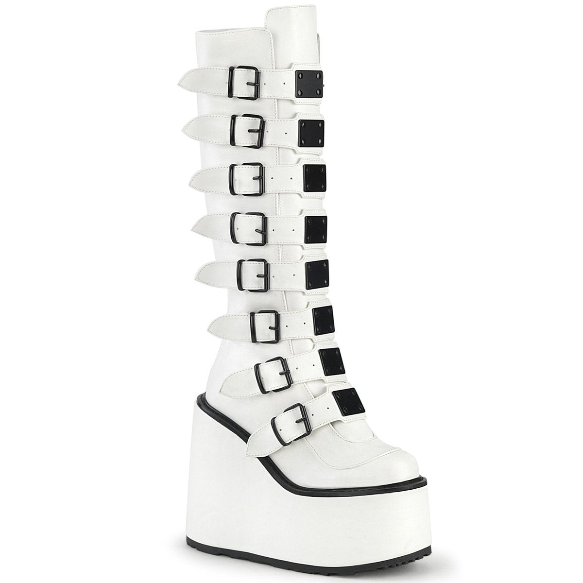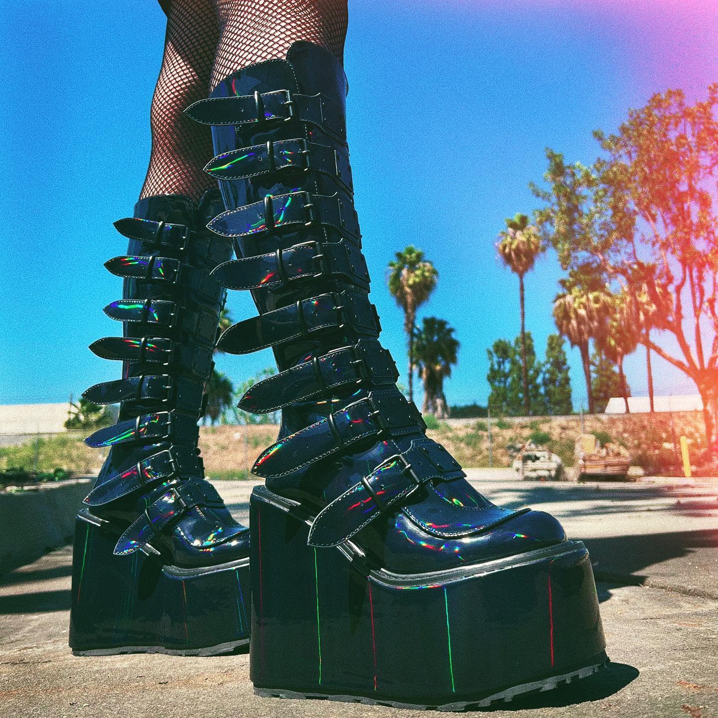 Bottes plateformes hautes avec huit sangles à boucle avec détail de plaque métallique, talon compensé haut et fermeture éclair latérale.