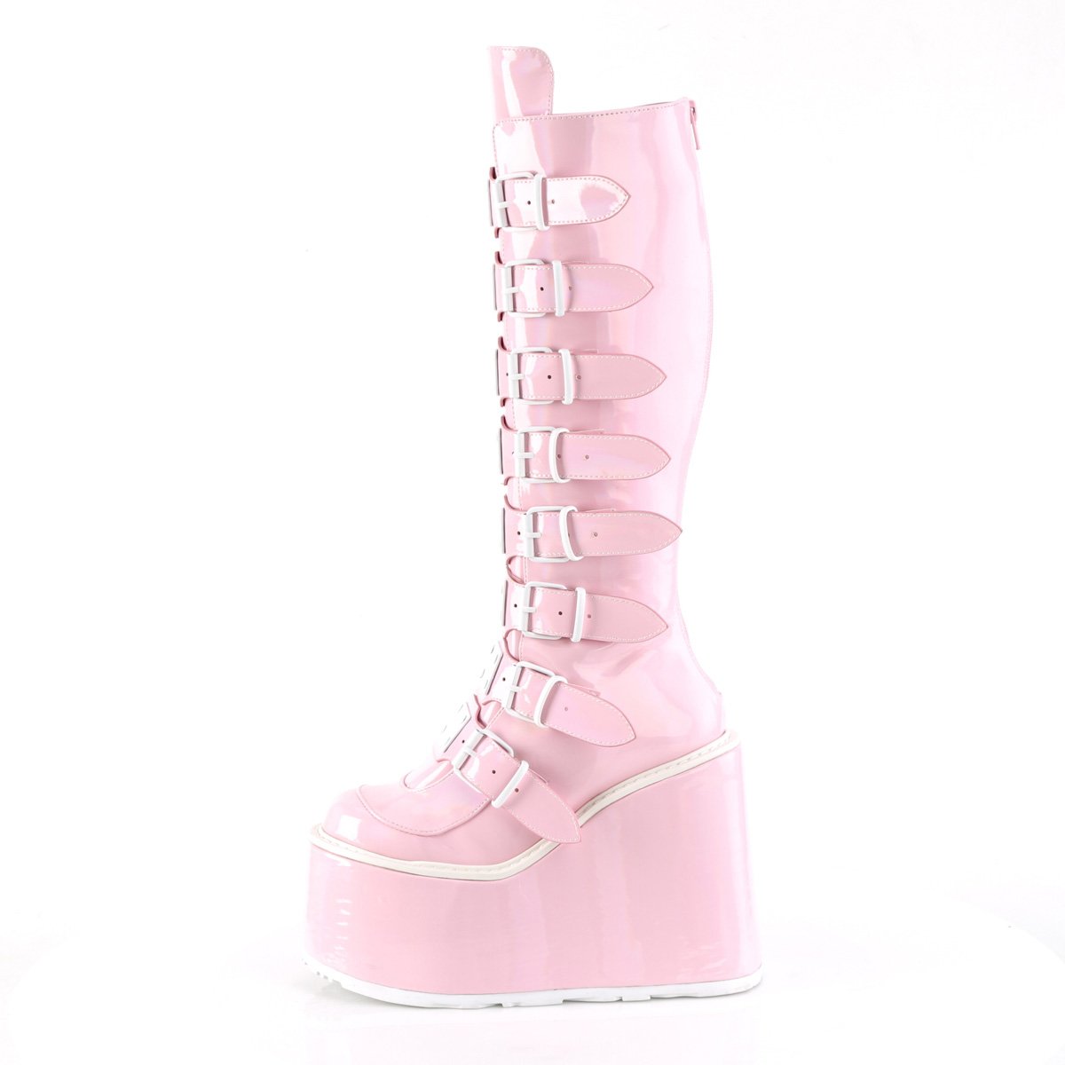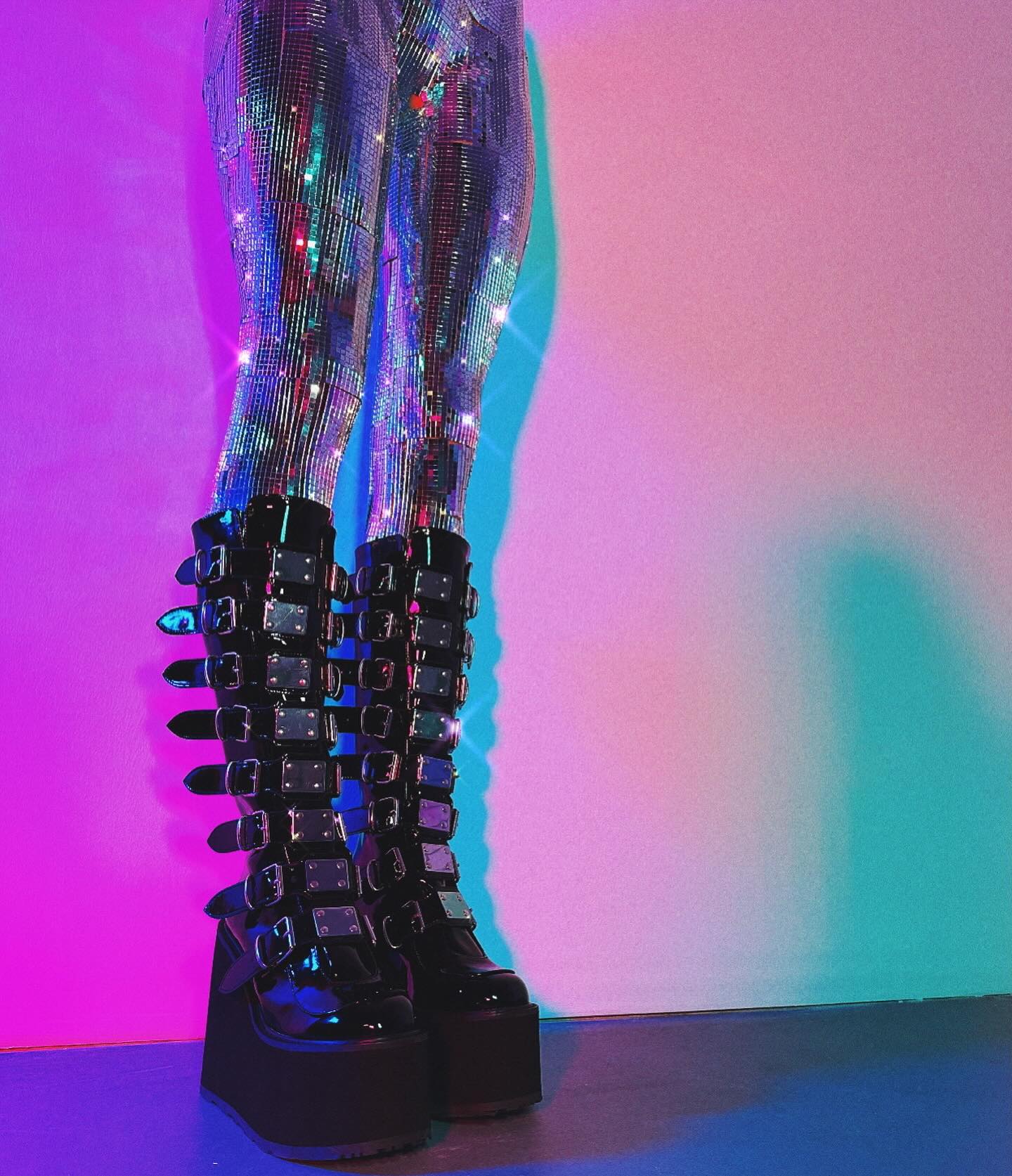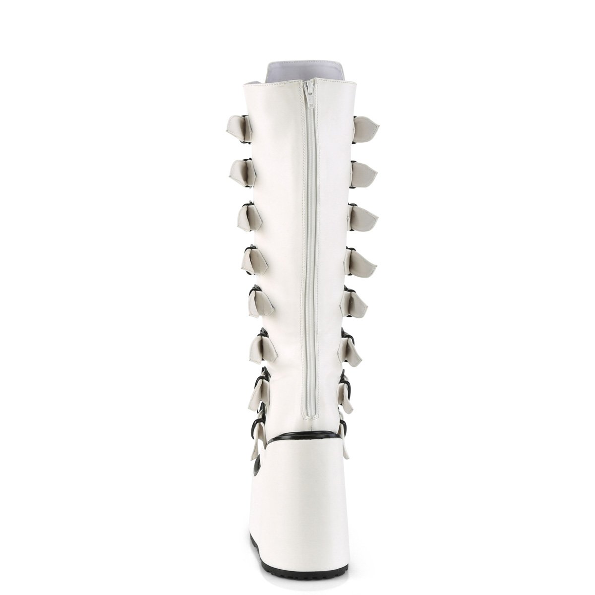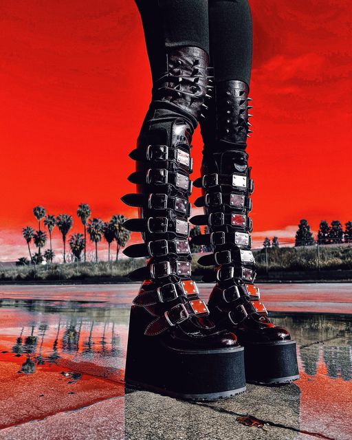 Bottes plateformes hautes avec huit sangles à boucle avec détail de plaque métallique, talon compensé haut et fermeture éclair latérale.