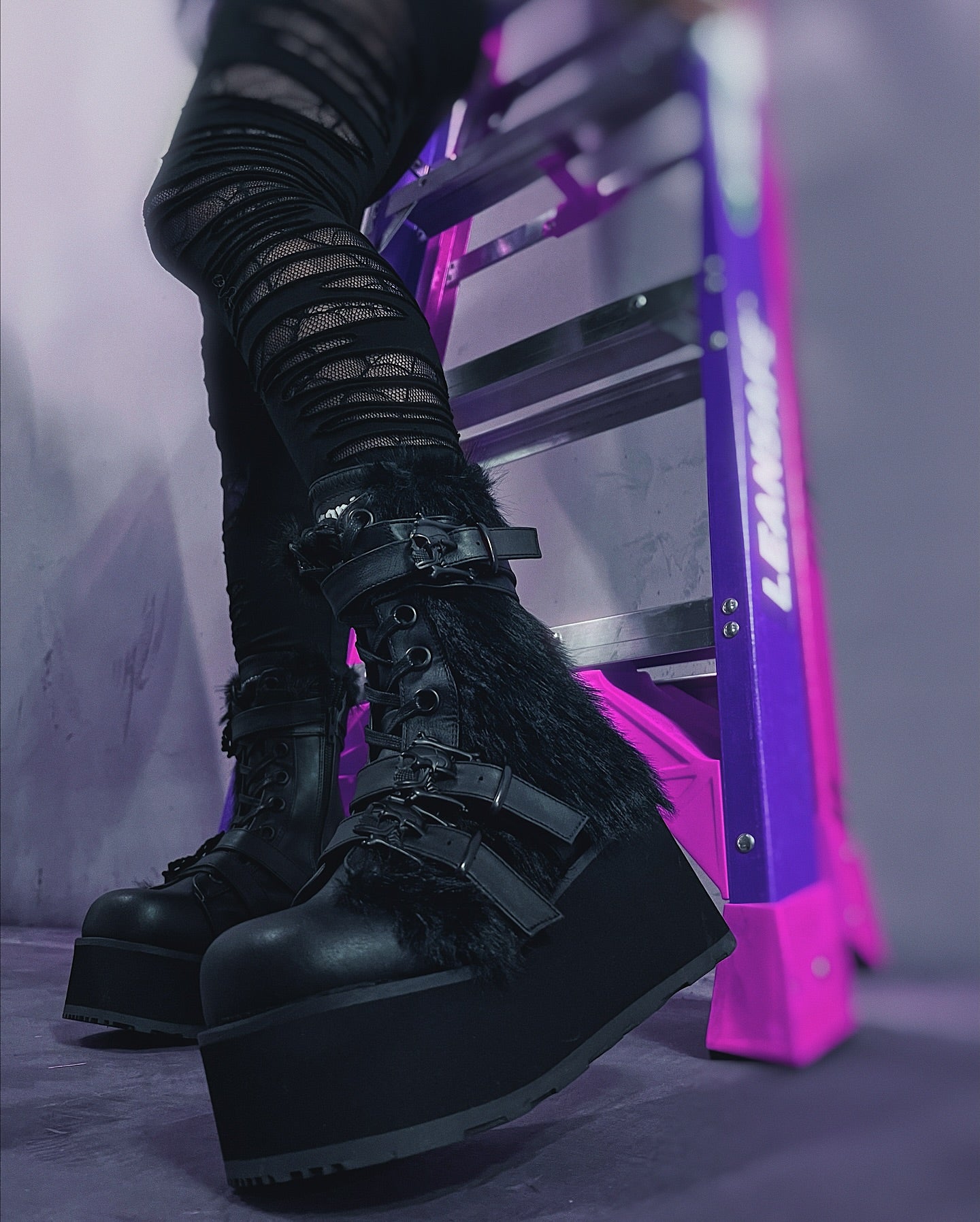Une silhouette à la mode et follement fabuleuse, cette botte à plateforme à lacets de 3 1/4 po (83 mm) à mi-mollet avec 3 sangles à boucle crâne et un panneau extérieur de fourrure contrastant, une fermeture à glissière latérale intérieure en métal.
