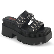 Cette sandale à claquettes est dotée d’un talon épais de 3 1/4 po et d’une plateforme à bout carré de 2 po avec doubles brides. Le design remarquable comprend des bandes de balles cloutées et une connexion de sangle centrale en laiton pour un look avant-gardiste.