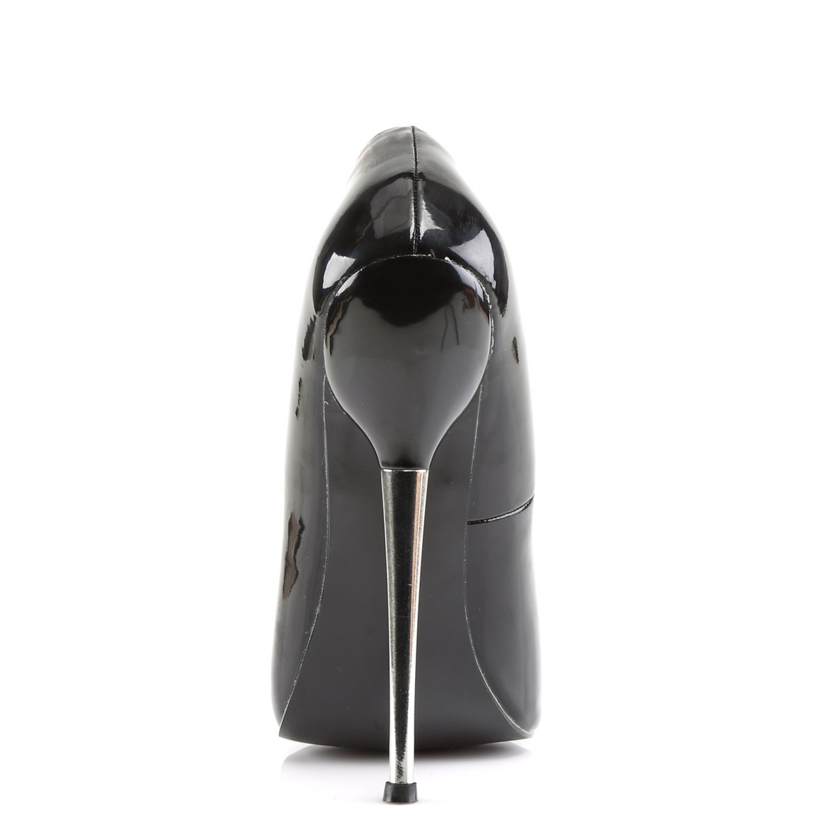 Chaussures de cour classiques fabriquées en verni noir avec embout pointu et talon aiguille extra haut avec finition métallique. L’éclat discret, leur look acéré et les talons de 6 pouces (15 cm) font de ces chaussures des looks fétichistes et des tenues érotiques.