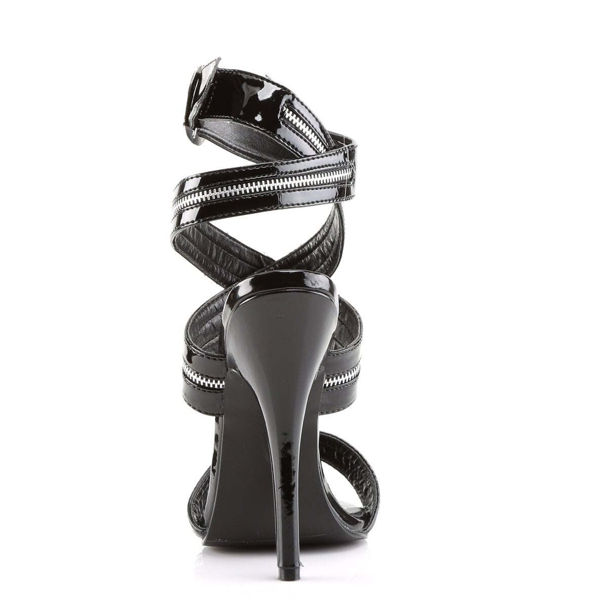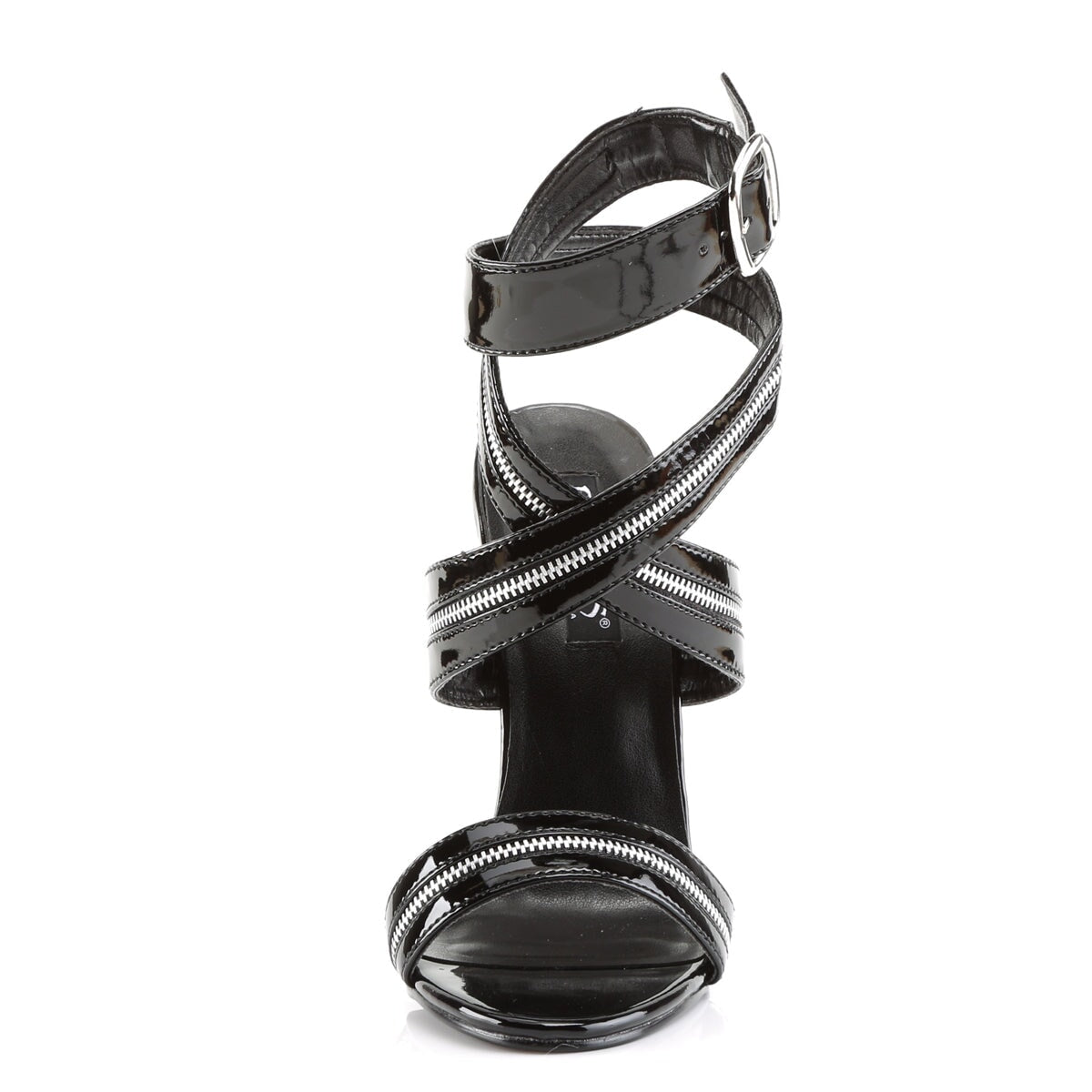 Sandales inspirées du rock avec des sangles zippées, une seule bretelle supérieure et deux lanières latérales qui s’enroulent deux fois autour de la cheville et se fixent d’un côté avec une boucle métallique surdimensionnée. Le talon aiguille de 6 pouces (15 cm) complète le look et ajoute encore plus de style à ces sandales provocantes.