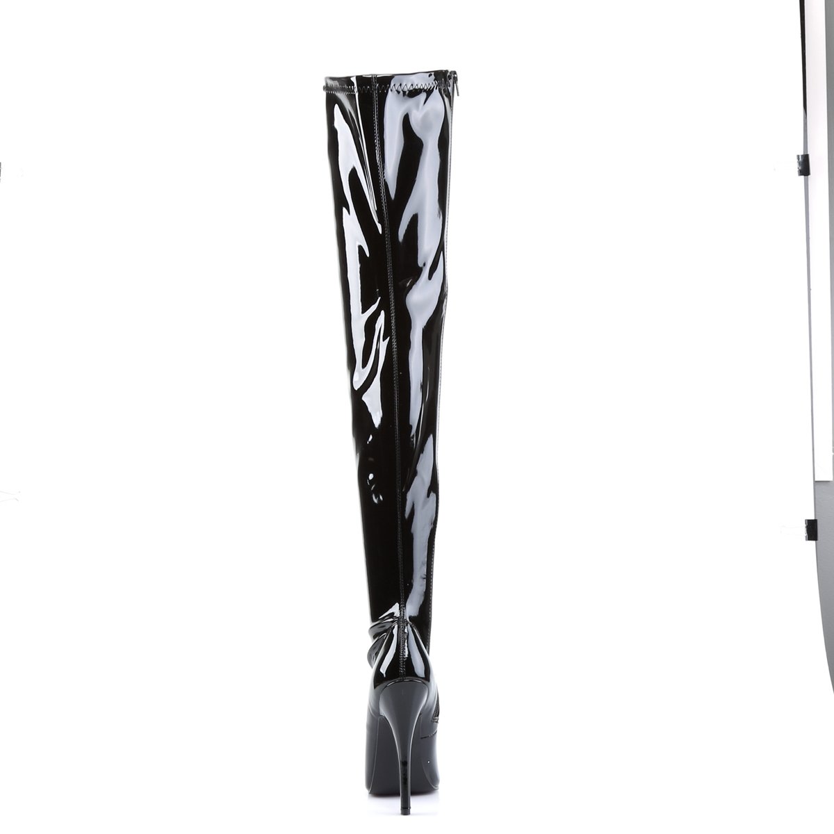 Bottes noires montantes à bout pointu, surpiqûres discrètes de ton à ton, finition mate et coupe extensible adaptée à votre look dominatrice. Le talon aiguille sexy de 6 pouces (15 cm) allonge les jambes pour un look provocateur qui attire et séduit, tandis que la fermeture éclair latérale permet de l’enfiler et de l’enlever facilement.