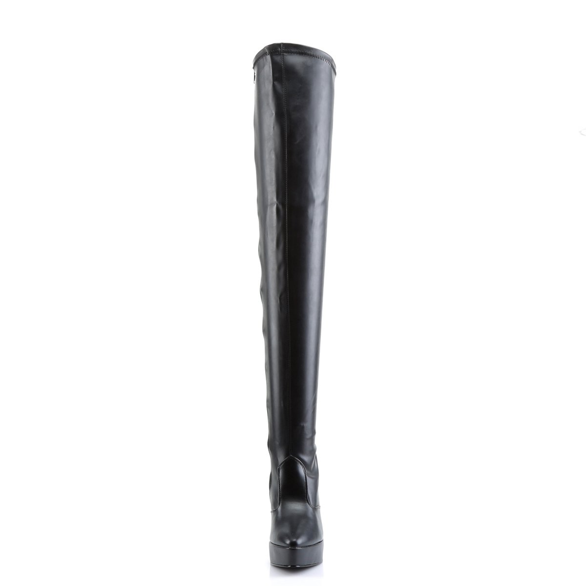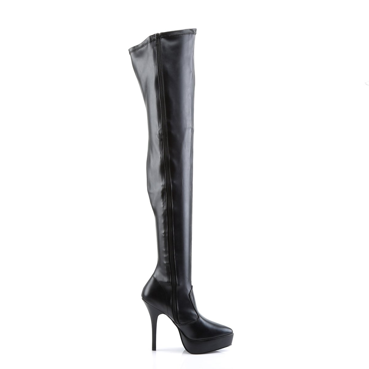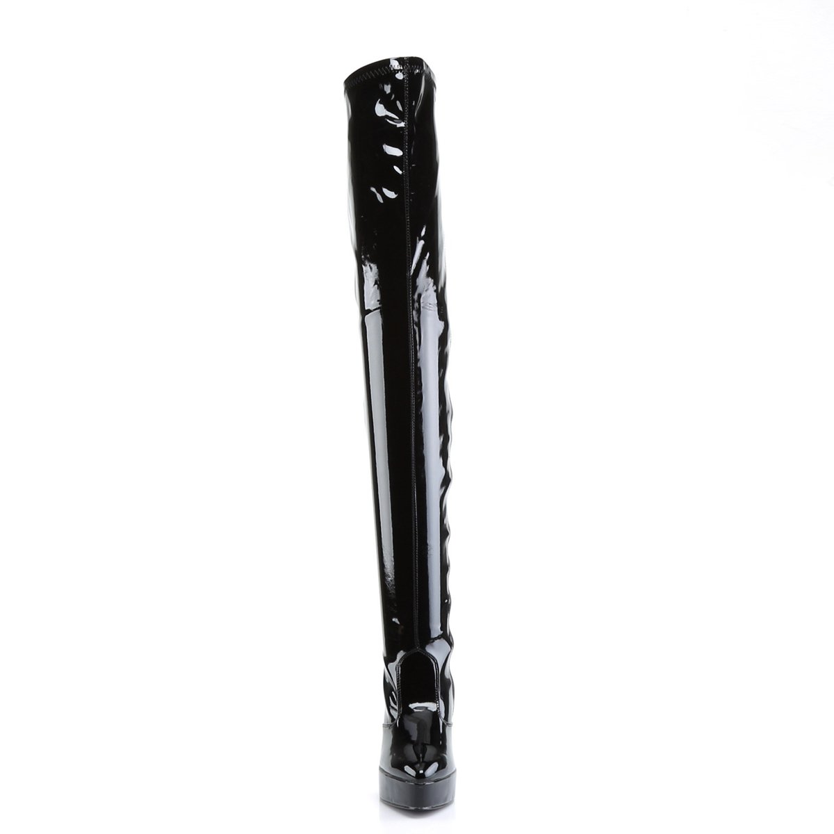 Des bottes sexy jusqu’à la cuisse, une finition brillante séduisante et une coupe asymétrique intéressante sur le dessus. La fermeture éclair latérale assure un port facile, tandis que les talons aiguilles de 5 pouces (12,5 cm) de haut ajoutent une touche sexy supplémentaire au design global. L’embout pointu est relevé par une plateforme avant, ce qui réduit la différence avant-dos pour un port confortable.