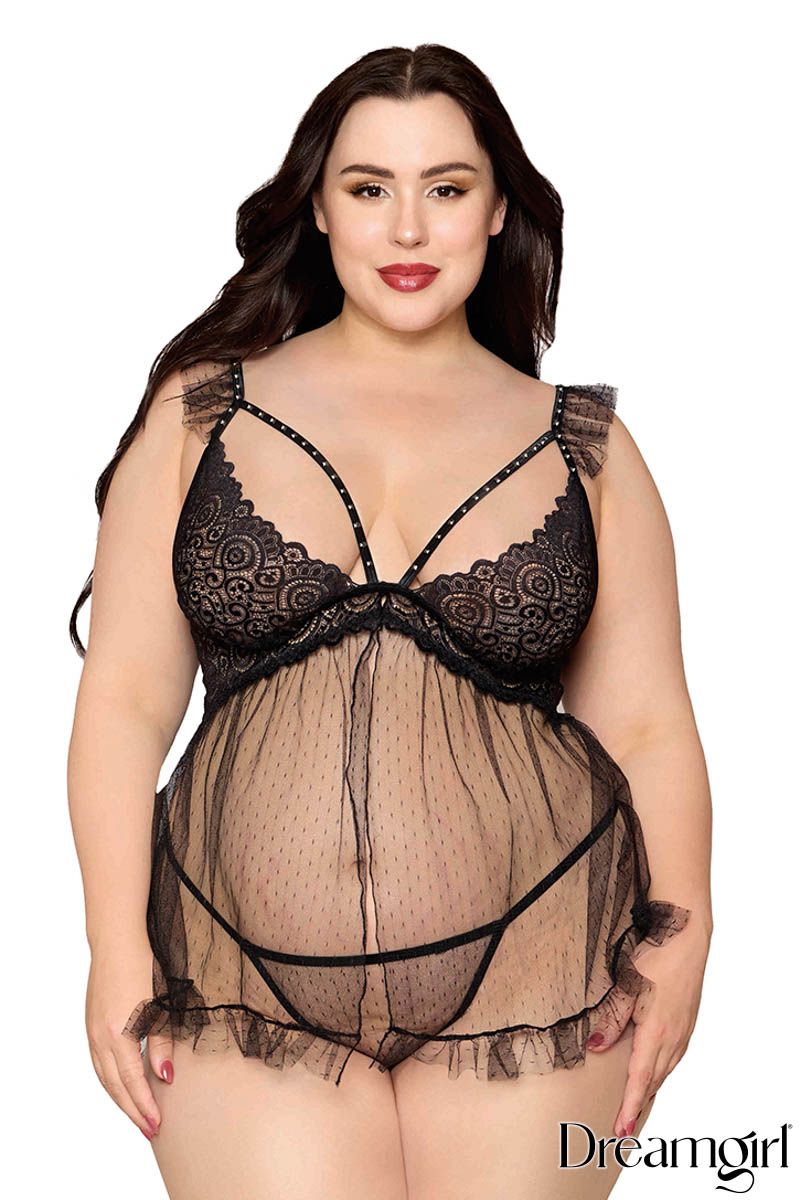 Babydoll en filet à pois avec une jupe flottante, une bordure à volants, des bretelles en strass sur des bonnets en dentelle douce, des bretelles ajustables bordées de dentelle et 2 bretelles réglables dans le dos. (String en maille de points assorti inclus)