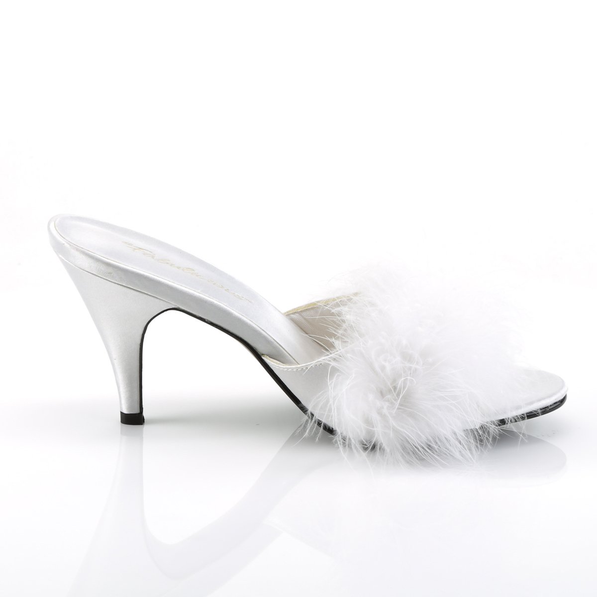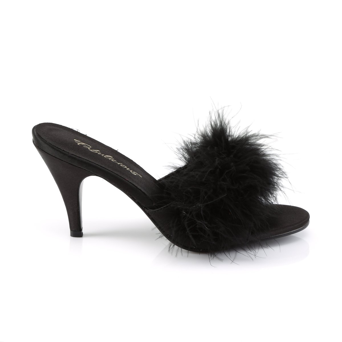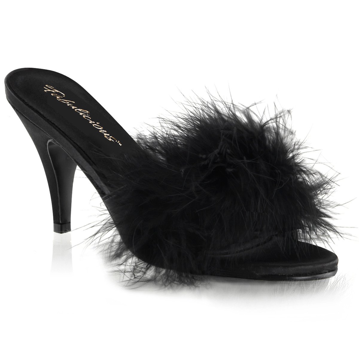 Une pantoufle marabou classique. Semelle simple, talon bas. Tige textile dans un style sandale habillée avec un bout rond et ouvert. Détails doux de plumes au niveau du vampire. Doublure lisse, semelle intérieure amortie. Semelle extérieure d’adhérence.