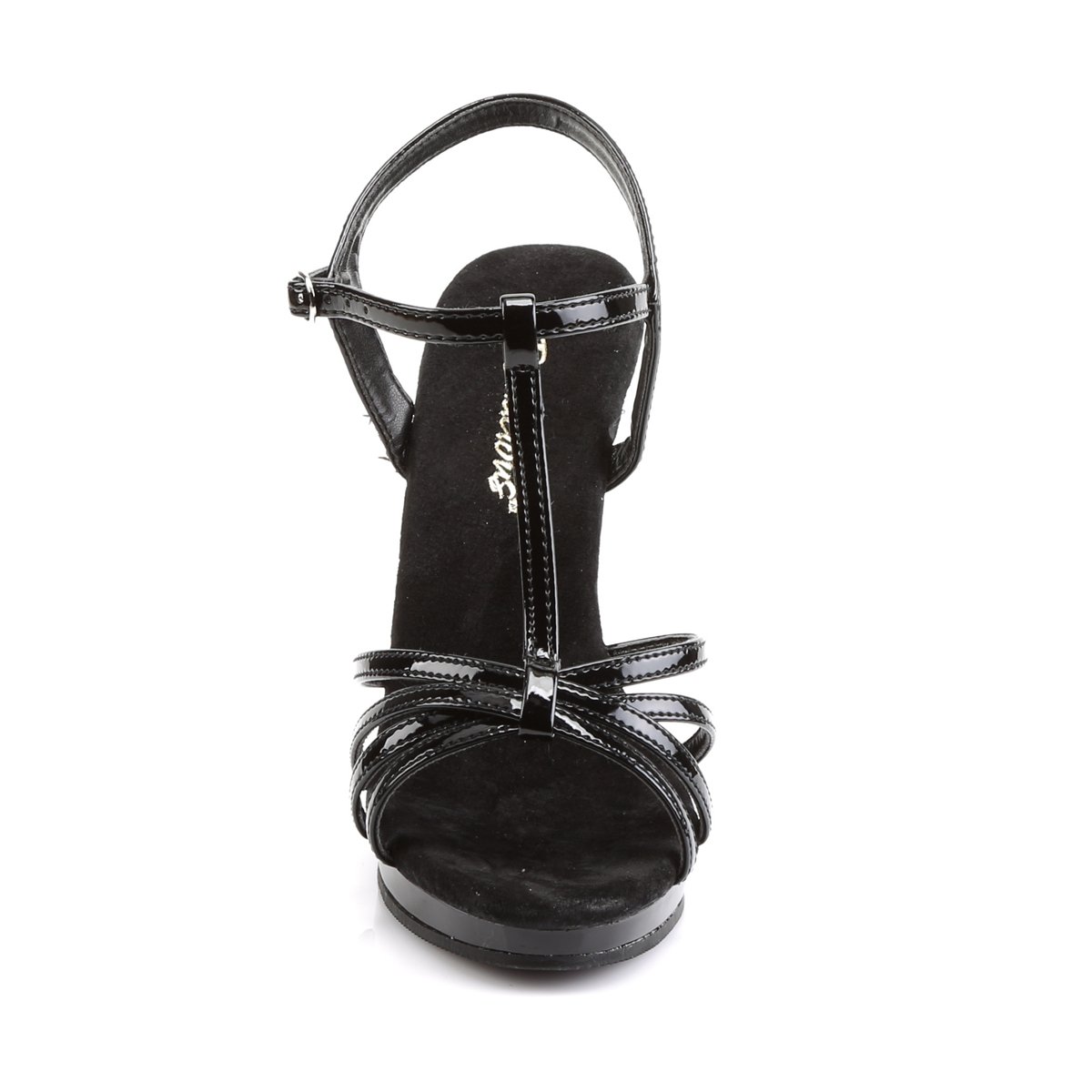 Des sandales vernies noires sexy avec de fines bretelles au niveau des orteils, rassemblées au milieu par une sangle en T montant sur le cou-de-pied et s’enroulant autour de la cheville pour plus de stabilité. Le talon aiguille ultra haut de 4,5" (11,5 cm) sculpte les jambes pour un look provocateur, tandis que la mini-plateforme avant assortie réduit la différence avant-dos pour un port sans effort.