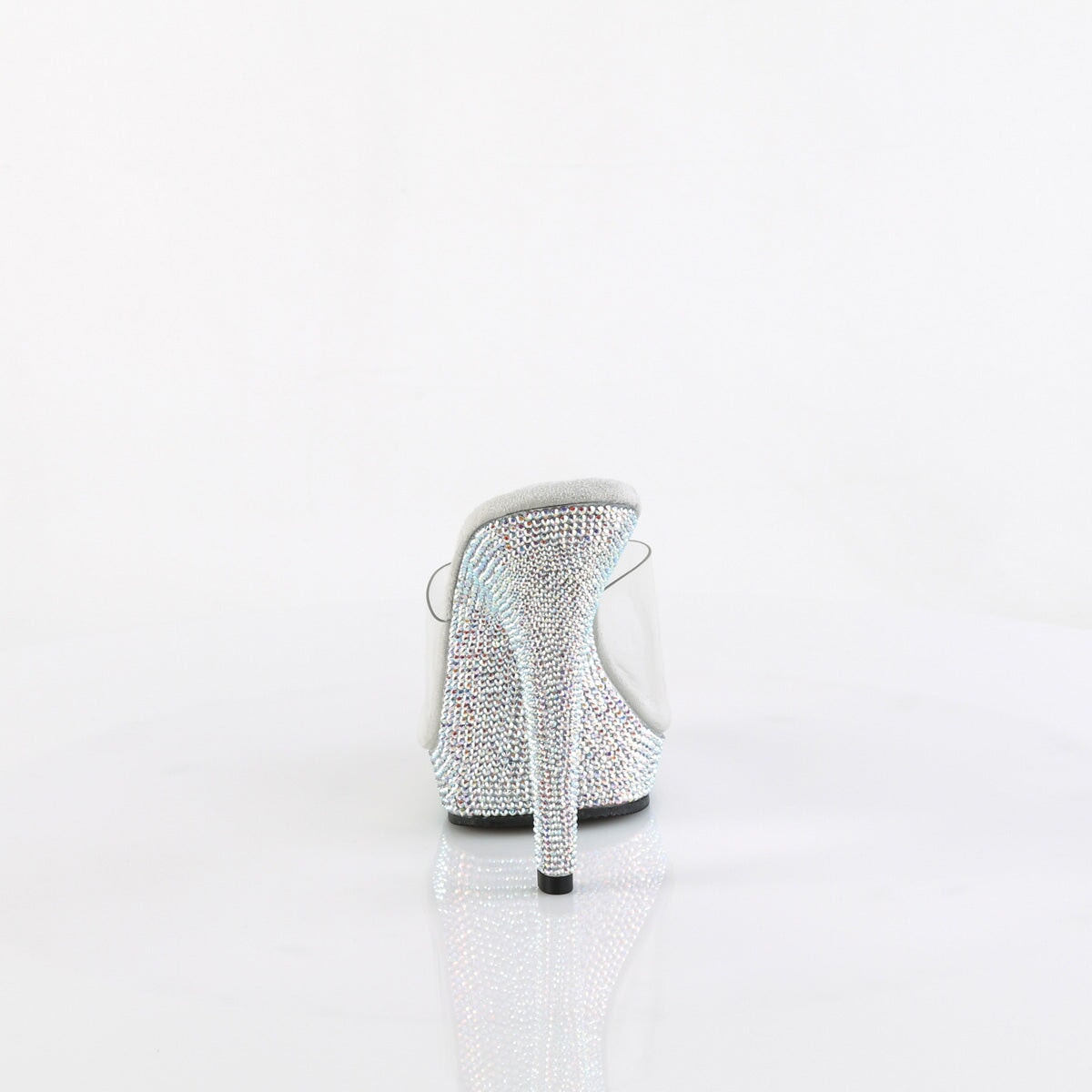 Un look ultra-sexy et énergique vient de PleaserGlissade des lèvres. Des mules entièrement transparentes avec des talons aiguilles de 5 pouces (12,5 cm) de haut et une plateforme avant de 0,75 pouce (2 cm). Orné de cristaux sur plateforme et talons. Sa semelle intérieure rembourrée et sudée aide à rester confortable tout le temps.