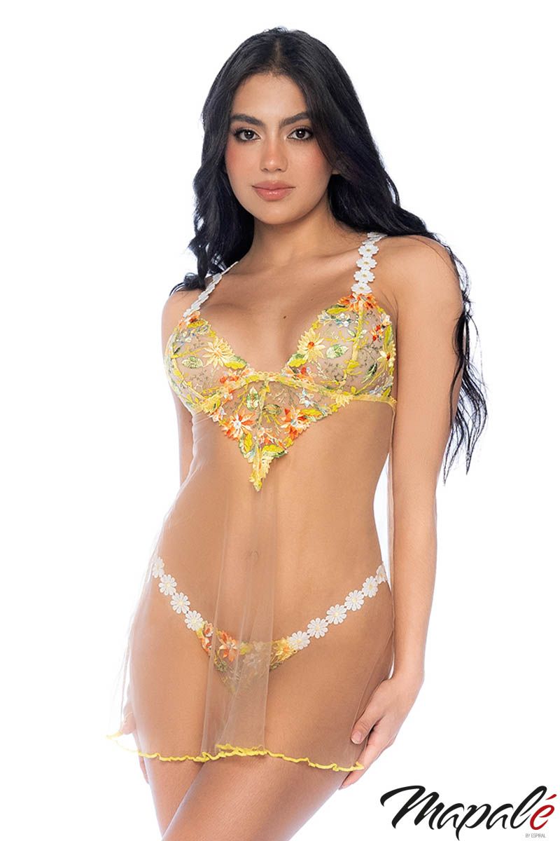 Nuisette en maille nude transparente avec dentelle florale sur le devant, bonnets doux non doublés et bretelles de marguerite réglables. (String assorti avec bretelles réglables incluses)
