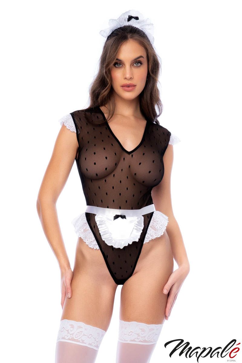 Ce teddy en maille haute transparente à pois présente des mini-manches en dentelle, des volants sur les hanches, une découpe élégante dans le dos et une fermeture pratique de l’entrejambe en crochet et œil. Il est accompagné d’un mini tablier orné de bordures en dentelle et d’une épaisse ceinture en soie à nouer, ainsi qu’un charmant bandeau de servante en dentelle pour compléter le look.