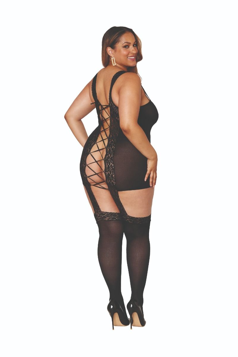 Robe jarretière en dentelle extensible réversible avec des sangles épaisses en dentelle fixe, un dos à lacets ajustable et des bas transparents attachés par des jarretières en dentelle fixe (string non inclus)