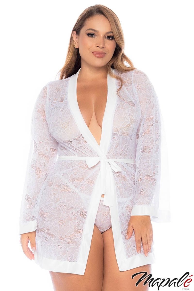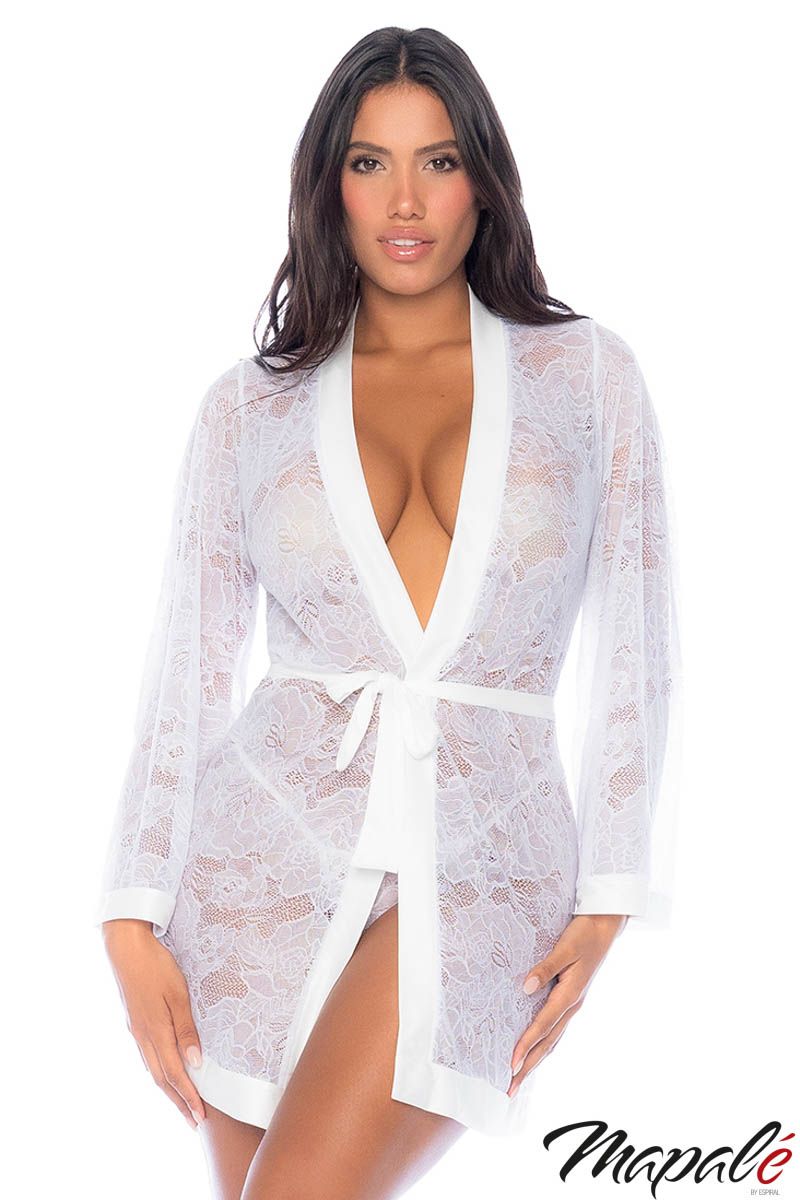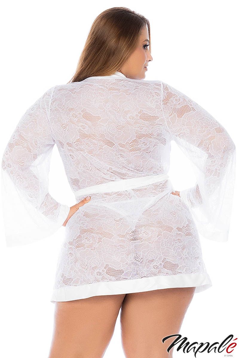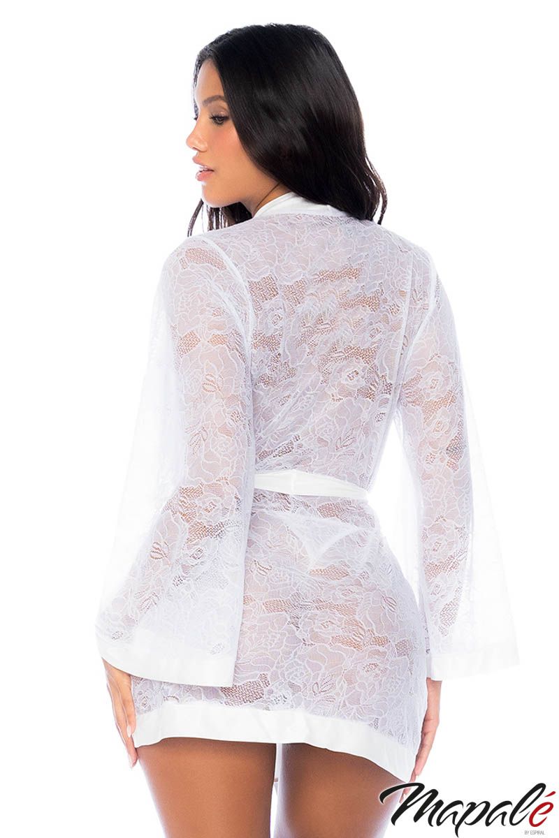 Robe à manches longues en dentelle florale avec une épaisse bordure en satin et une ceinture à nouer en satin brillant. (String non inclus)