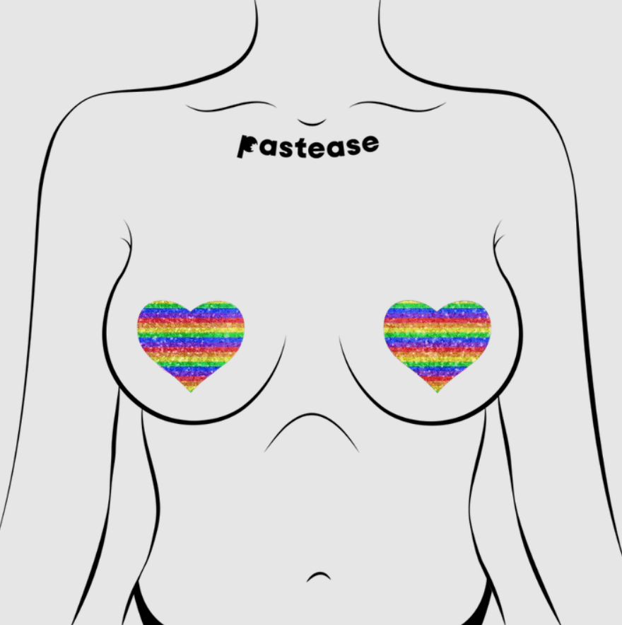 Love: Glittering Double Rainbow Heart Nipple Pasties by Pastease® are hand-made in the USA of soft sparkling velvet material that forms seamlessly to curves and resists wrinkling over hardening nipples.