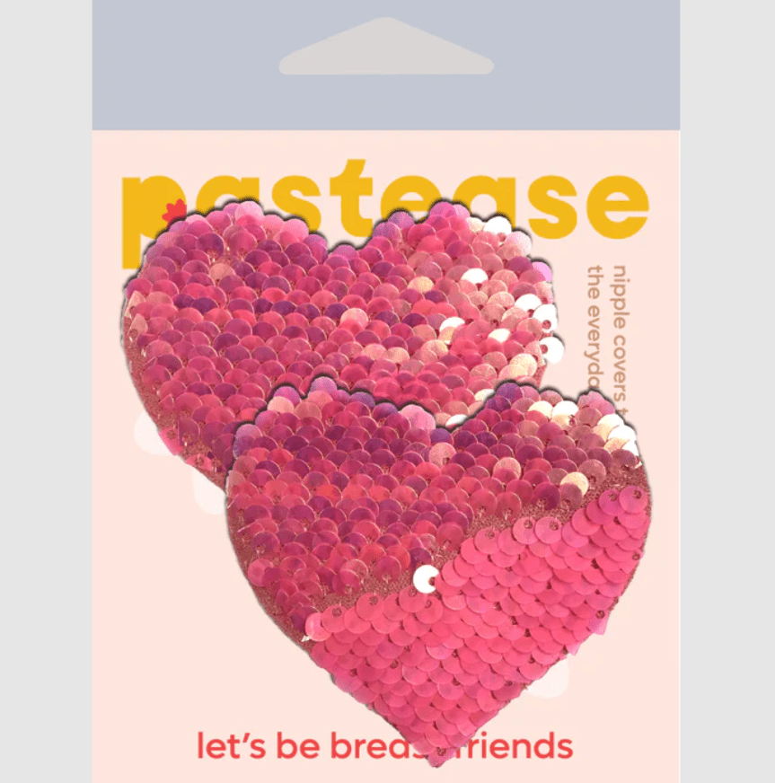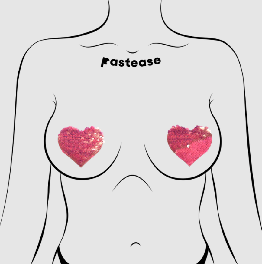 Rose vif & Rose mat Les pâtés de tétons en forme de cœur à sequins changeants de Pastease® sont fabriqués à la main aux États-Unis avec un matériau réversible de sequins qui forme les courbes et résiste aux plis sur les mamelons durcis.