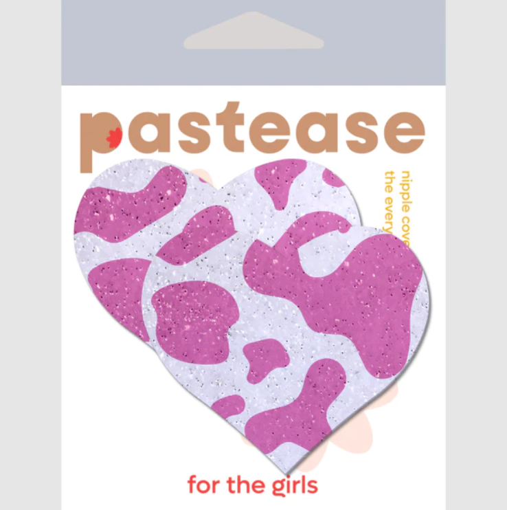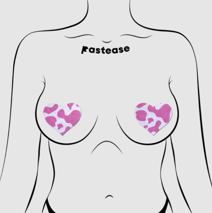 Love: Pink Strawberry Cow Print Heart Pasties by Pastease® are hand-made in the USA of soft form-fitting glitter velvet material that forms seamlessly to curves and resists wrinkling over hardening nipples.
