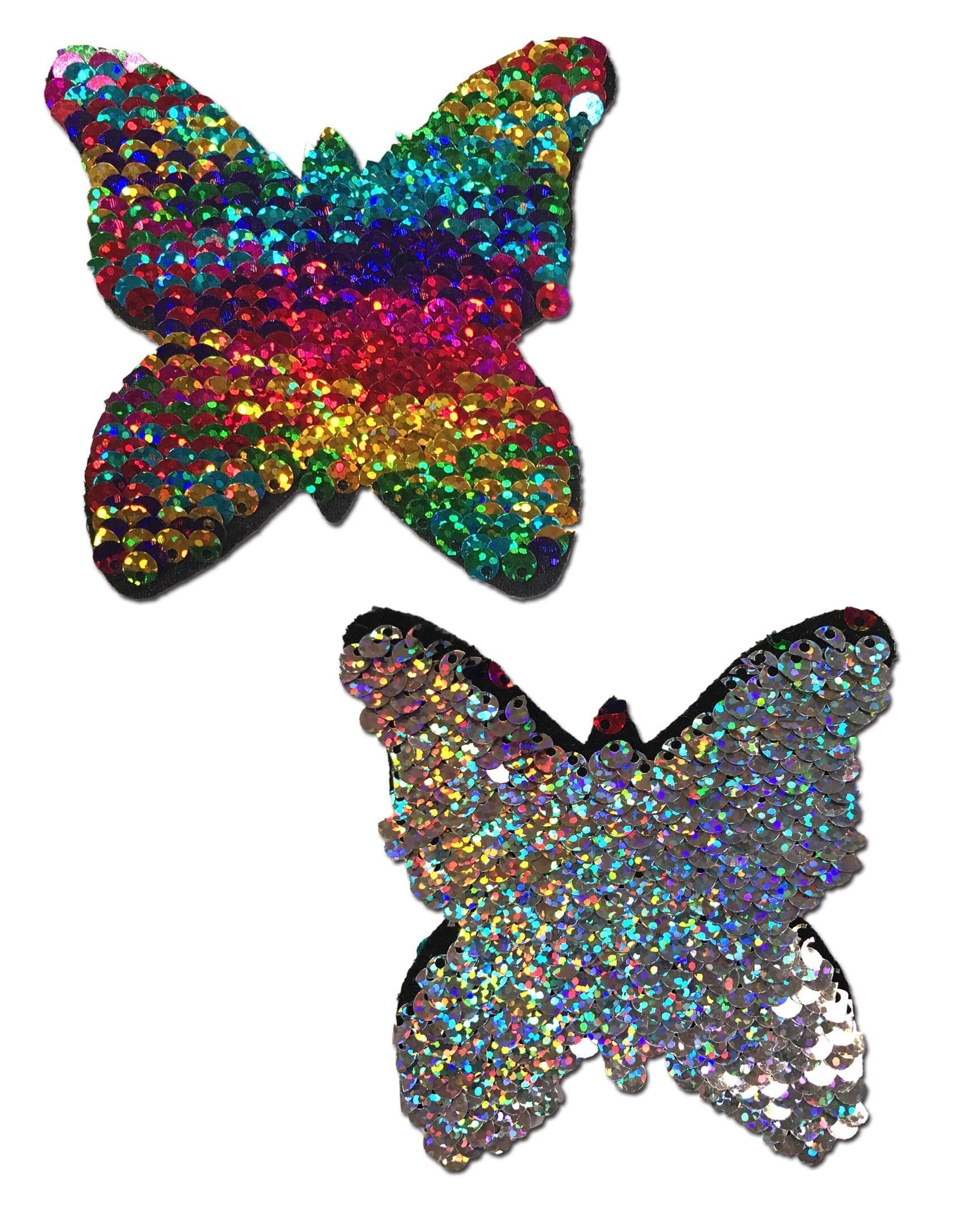 Monarch : Rainbow & Silver Glitter Color Changing Pastilles Patelettes Sequin Pasties de Pastease® sont fabriquées à la main aux États-Unis à partir d’un matériau réversible de sequins qui forme des courbes et résiste aux plis sur les mamelons durcis.