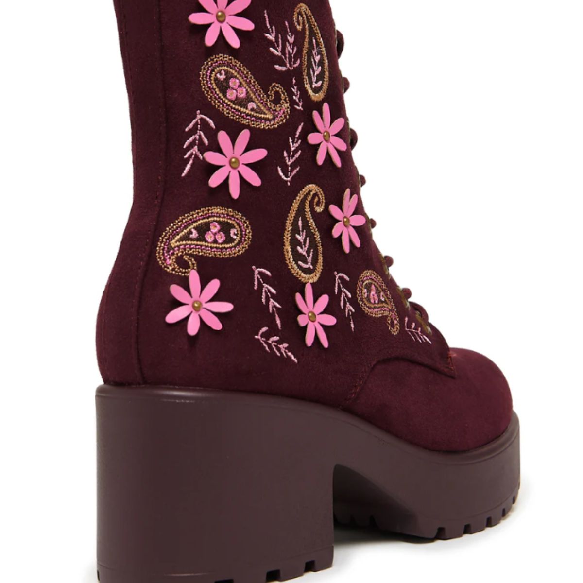 Ambiance western avec une touche florale de KOI. Les bottes en suède Moonlit Ember mélangent des tons automnaux riches avec des appliqués brodés de motifs cachemire et de marguerite rose qui fleurissent sur la tige. Conçues avec une finition douce en faux suède, ces lacets apportent une dose de nostalgie et d’ambiance aux tenues plus fraîches.