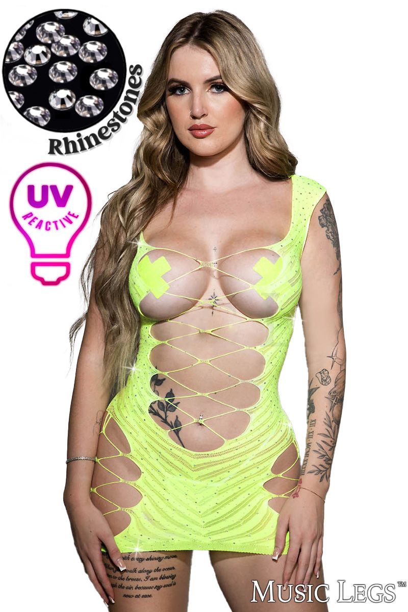 Robe en filet ajustée avec des ouvertures décolletées décorées d’élastiques croisés de strass étincelants. (String et écussons non inclus)