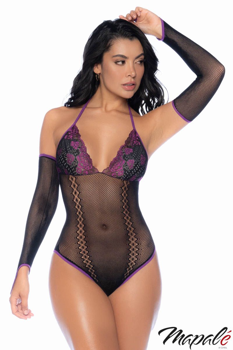 Teddy résille avec dentelle florale contrastante sur des bonnets triangle doux, col halter à col noué et découpes à brides à l’avant. (Gants en filet assortis avec boucle pour le majeur inclus)