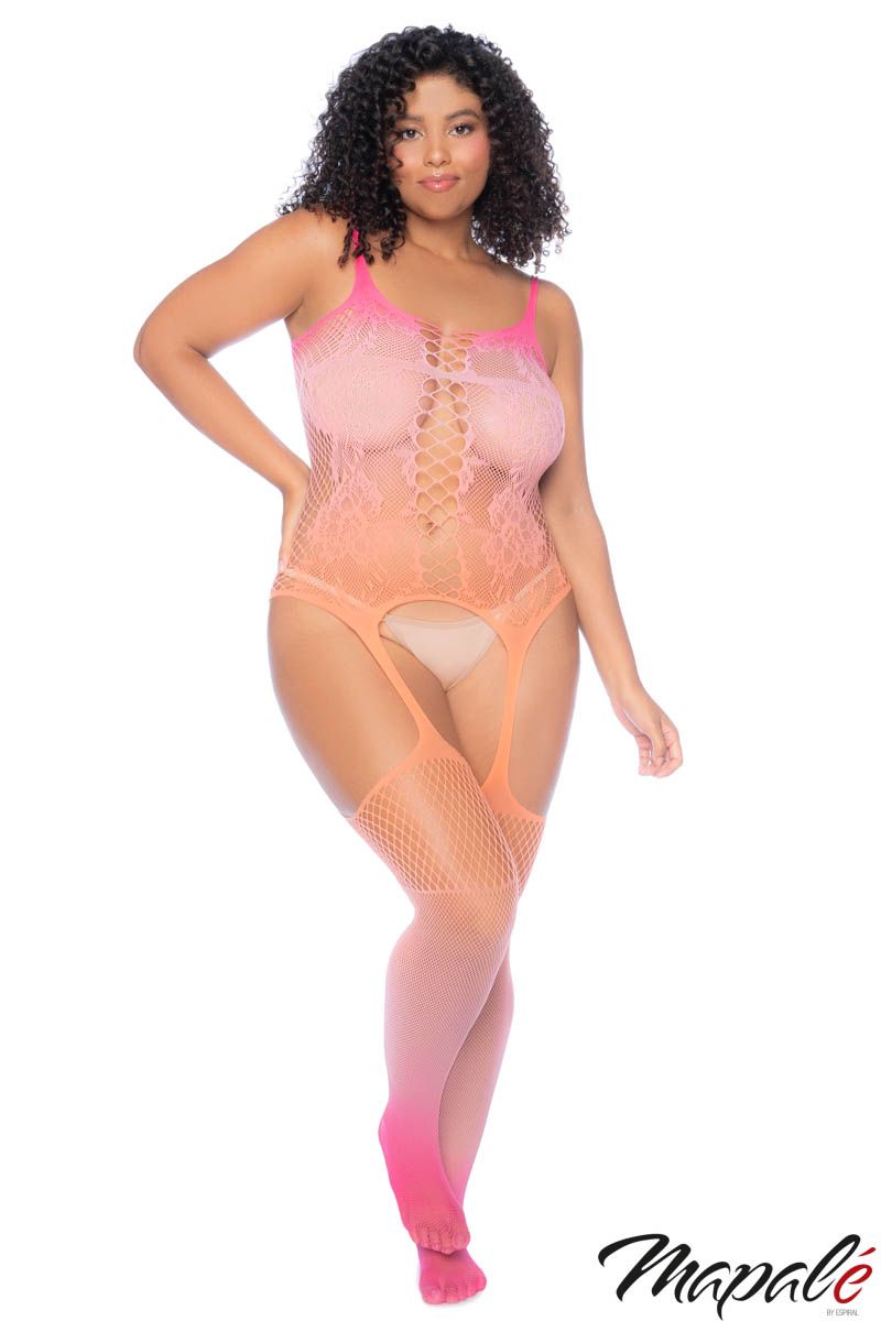 Body en dentelle stretch ombré avec un décolleté en filet plongeant, des bretelles élastiques fixes et des bas résille assortis attachés par des jarretières élastiques fixes. (Corde de sol non incluse)