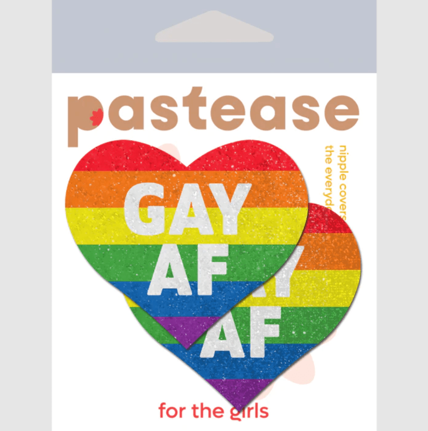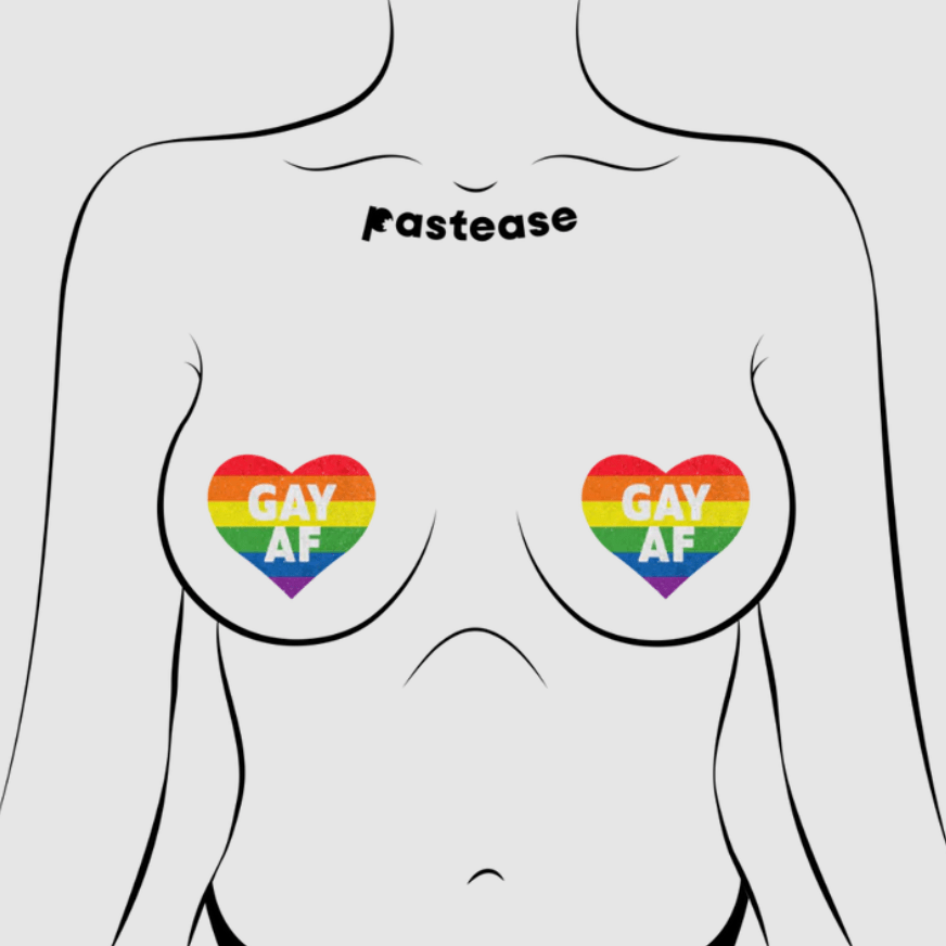Celebrate! Love: Rainbow 'GAY AF' on Glitter Velvet Heart Nipple Pasties by Pastease® are hand-made in the USA of soft form-fitting glitter velvet material that forms seamlessly to curves and resists wrinkling over hardening nipples.