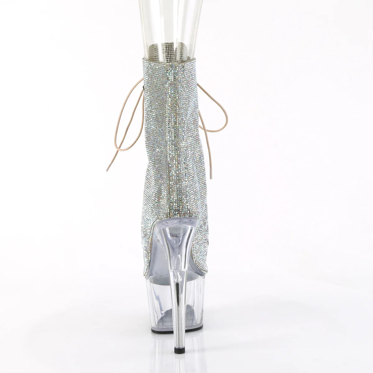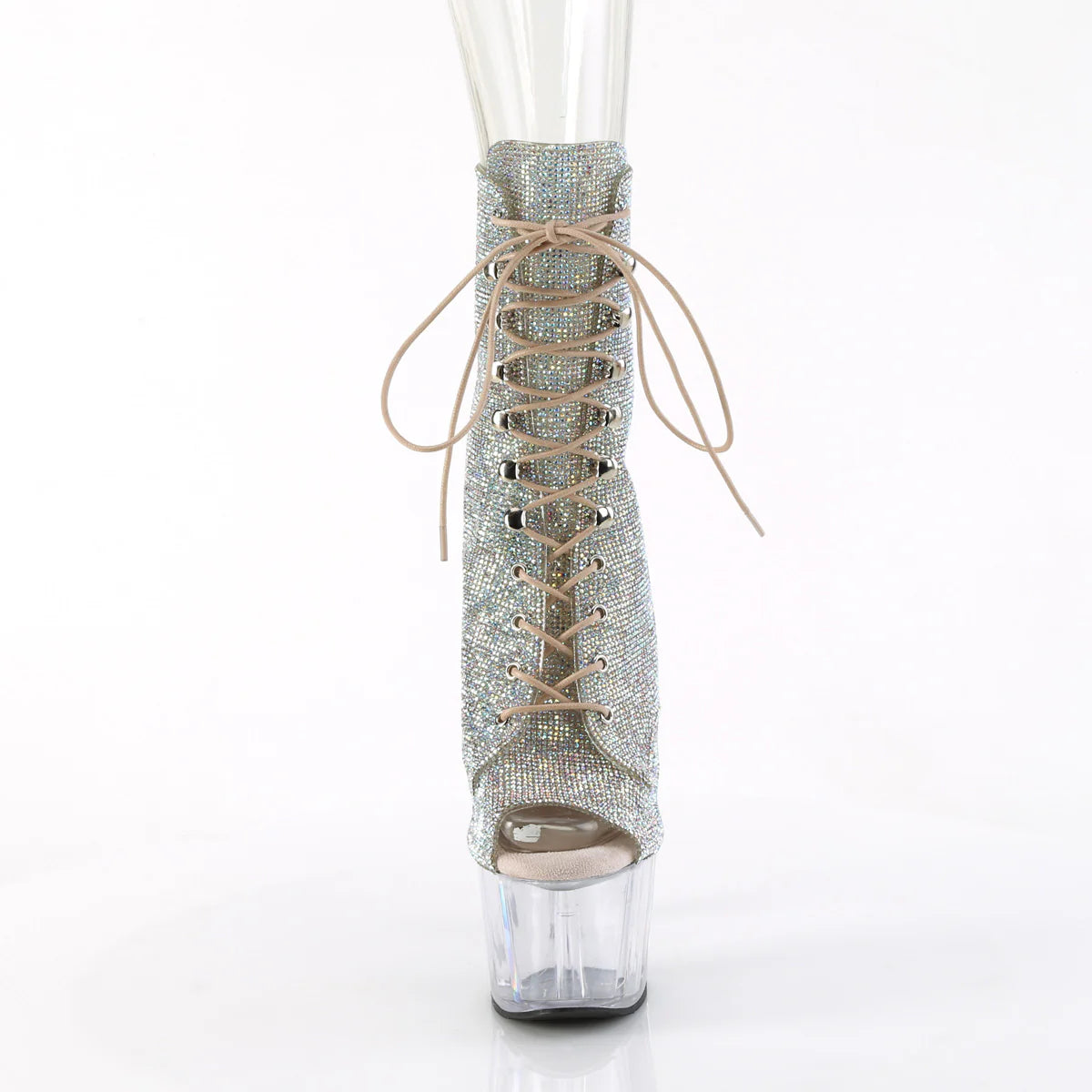 Cette bottine à bout éperté se distingue par un talon spectaculaire de 7 pouces et une plateforme de 2 3/4 po, avec un avant lacé et une tige ornée de strass. Il est aussi doté d’une fermeture éclair latérale pratique pour faciliter l’habillage.