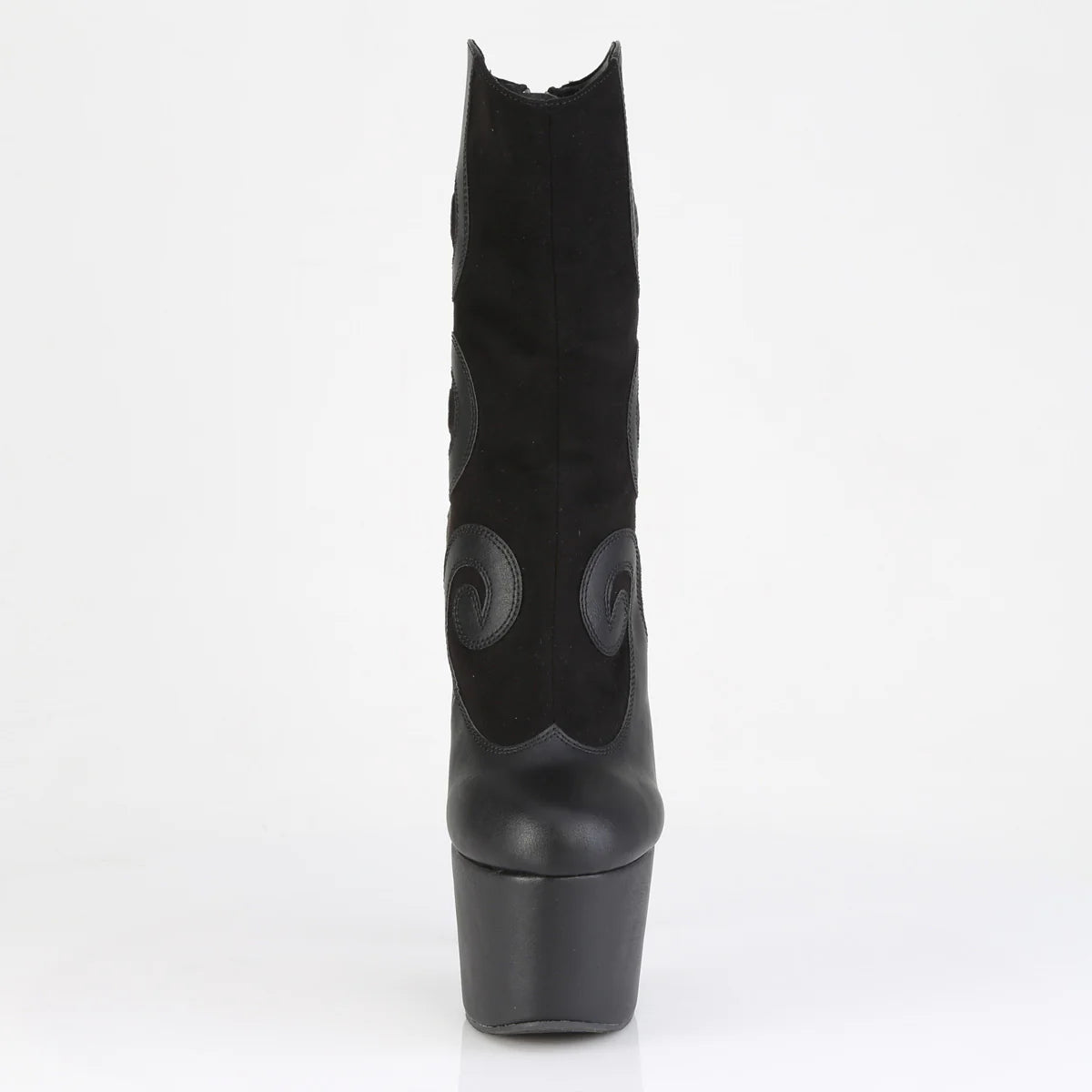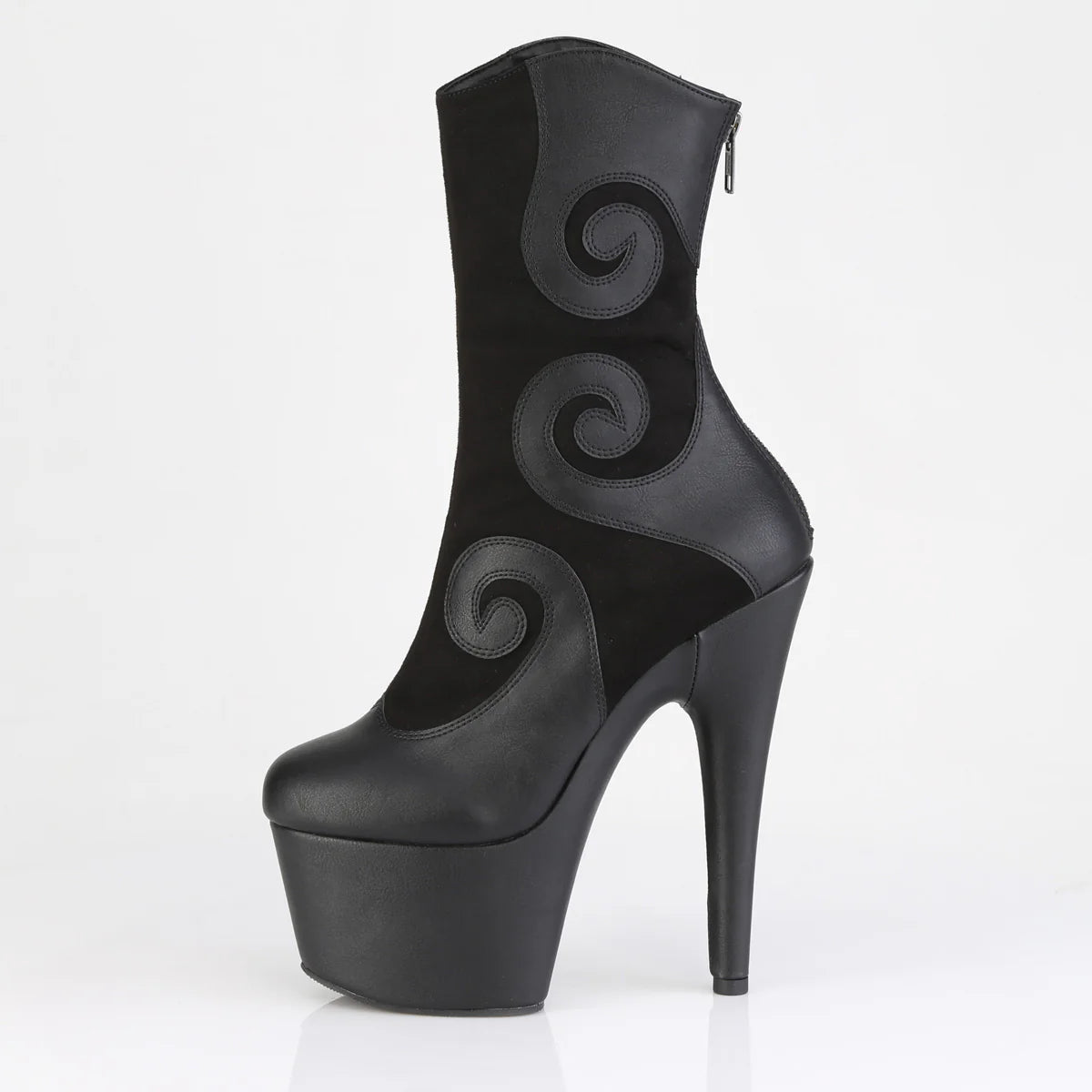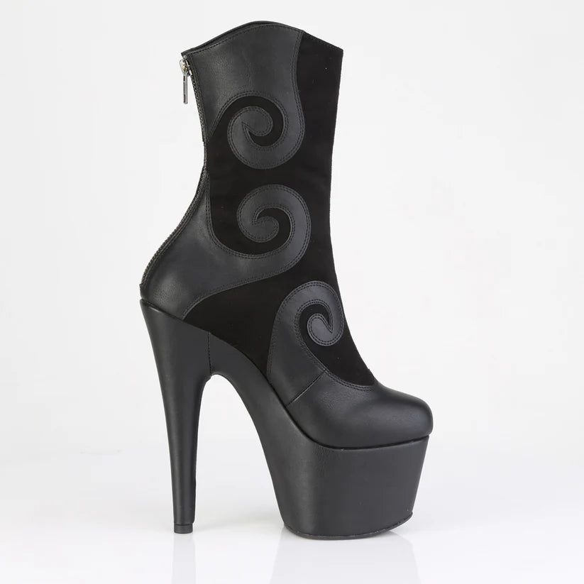 Cette botte présente un talon audacieux de 7 po et une plateforme de 2 3/4 po avec un motif Spiralis unique. Il comprend une fermeture à glissière arrière pratique pour un port facile.