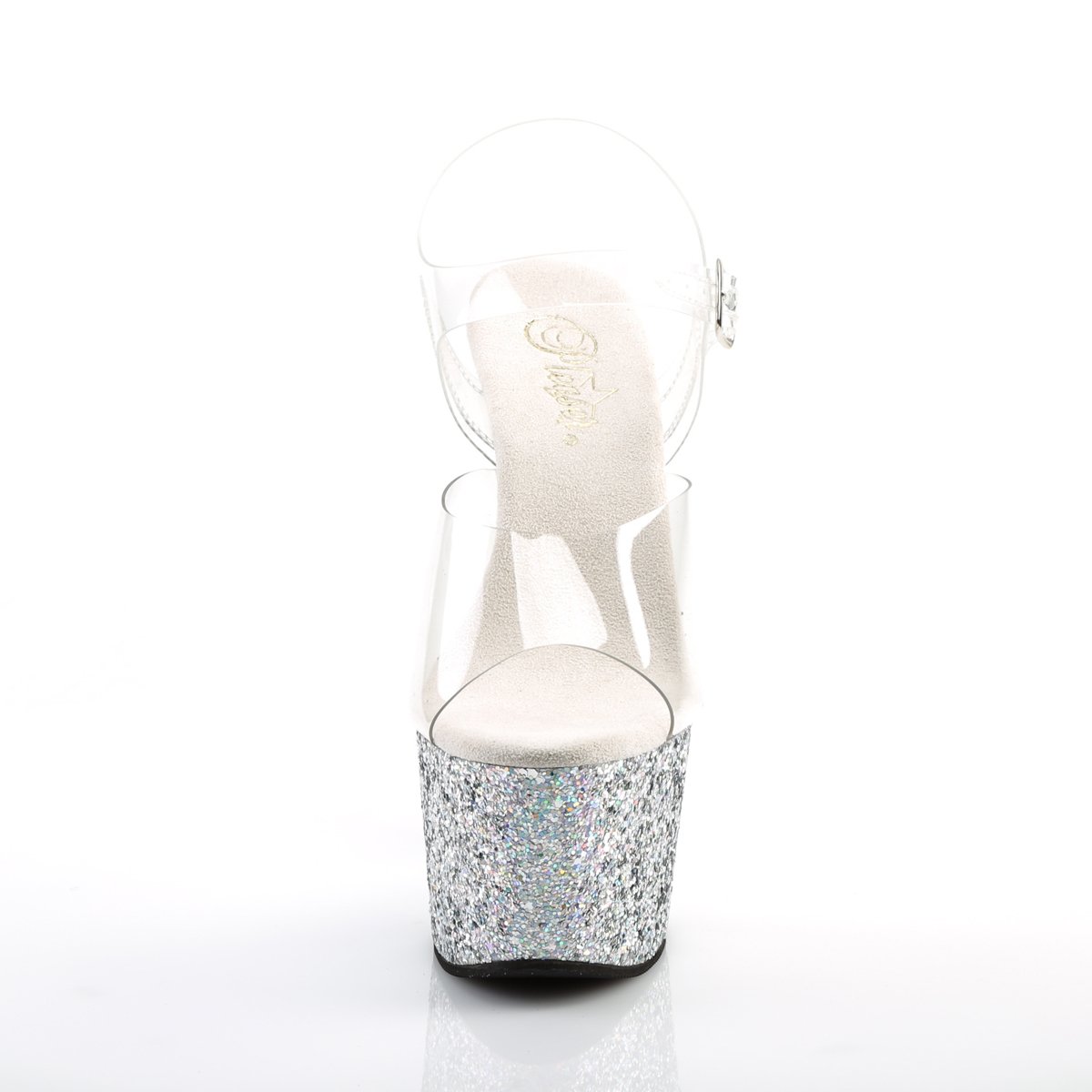 Talon de 7 » (17 cm), sandale à bretelle à plateforme de 2 3/4 » (7 cm) avec des paillettes holographiques couvrant tout le bas de la plateforme