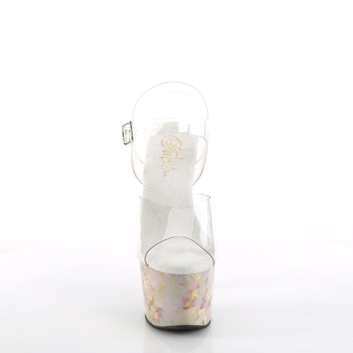 Une superbe sandale à talon de 7 » (178 mm), avec une lanière à plateforme de 2 3/4 » (70 mm) et un bas plateau imprimé effet marbre.