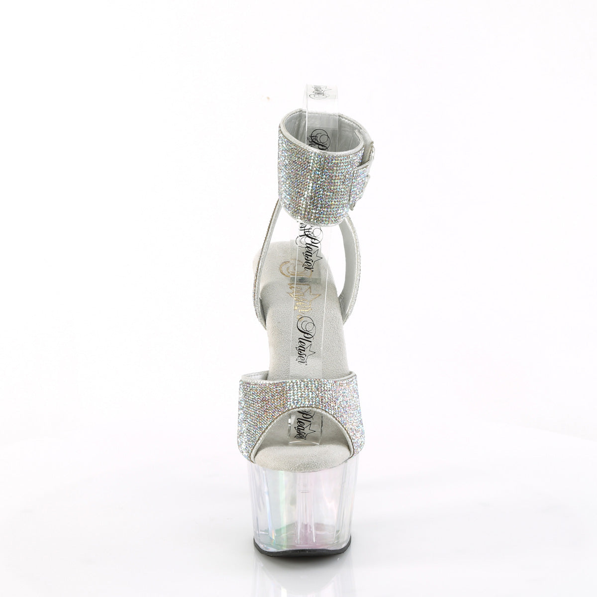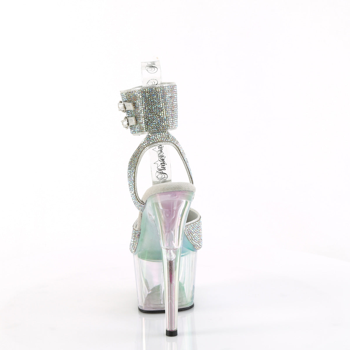 Entrez sous les projecteurs avec ces sandales à talons de 7" (178 mm) à poignet de cheville. Ils présentent un éblouissant avant orné de strass, une large cheville avec deux sangles à boucle, et un bas à plateforme holographique captivant, assurant que vous brilliez à chaque pas.