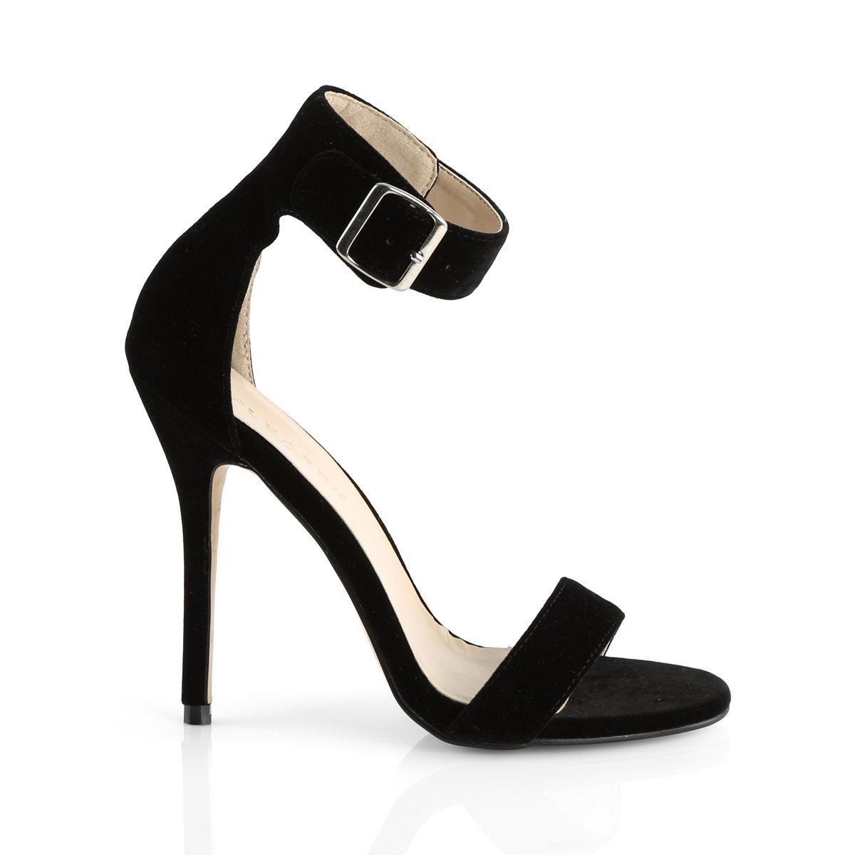Sandale élégante à dos fermé avec une lanière à la cheville bouclée. Une sangle mince dans la zone des orteils et un talon complet sur laquelle une sangle de cheville ajustable avec boucle métallique est attachée. Les talons aiguilles noirs de 5 pouces de haut ajoutent une longueur supplémentaire à vos jambes pour un look époustouflant.