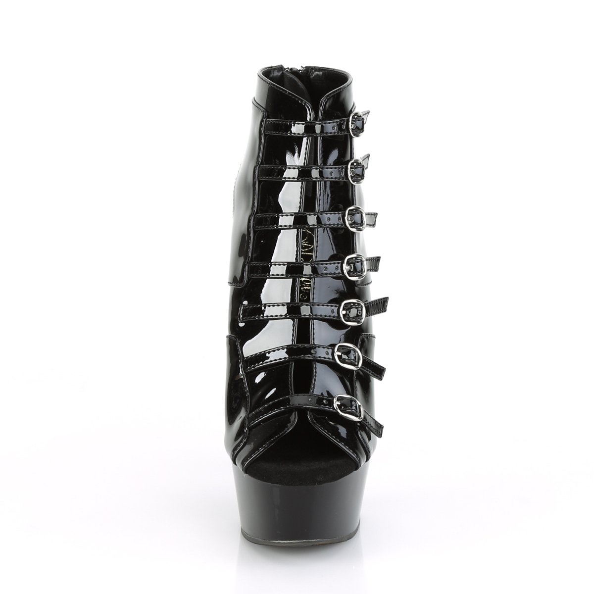 Bottillon élégant et sexy à talon de 152 mm (6 po) à talon, à plateforme de 1 3/4 po (45 mm) à bout ouvert à l’avant avec boucles multiples, détails de découpe latérale et fermeture à glissière à l’arrière.