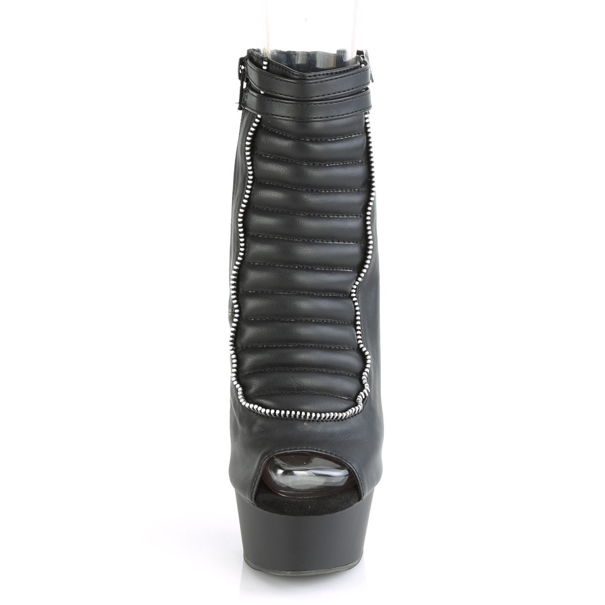 Bottines uniques et amusantes à talon de 6 po (152 mm), à plateforme de 1 3/4 po (45 mm) à bout ouvert/talon avec sangles de cheville à double boucle et panneau avant matelassé avec garniture à glissière en métal et fermeture à glissière intérieure.