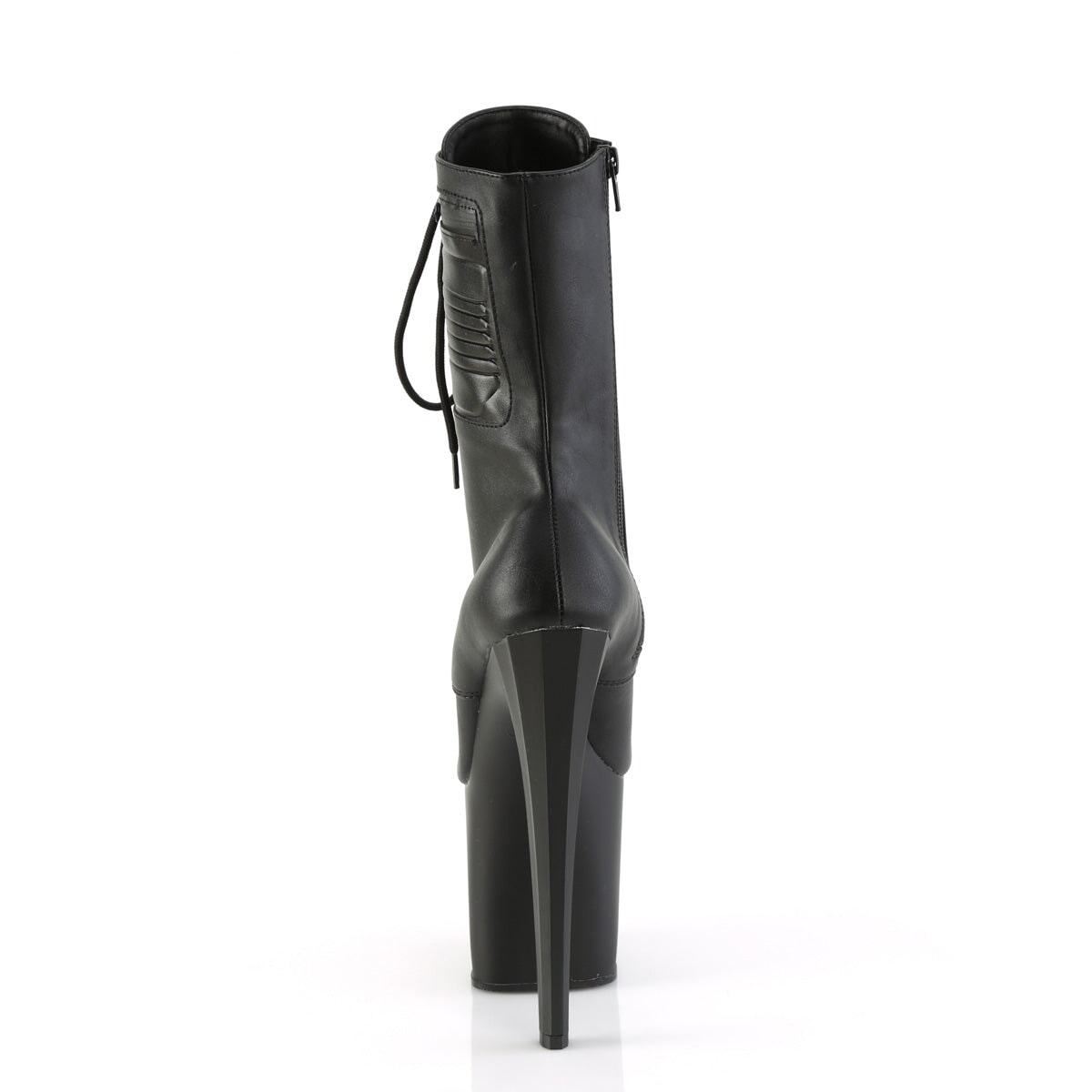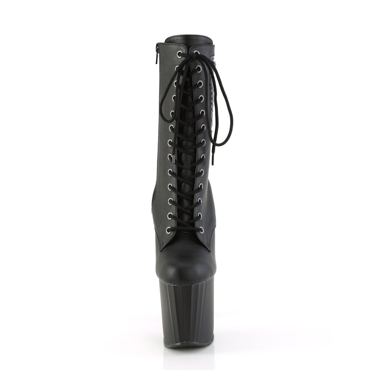 Talon de 7 1/2 » (191 mm), 3 1/2 » (89 mm) bottines à orteils à plateformes à orteils à lacets, avec poche extérieure zippée, avec un design linéaire prismatique à l’avant et à l’arrière du talon, fermeture éclair latérale intérieure