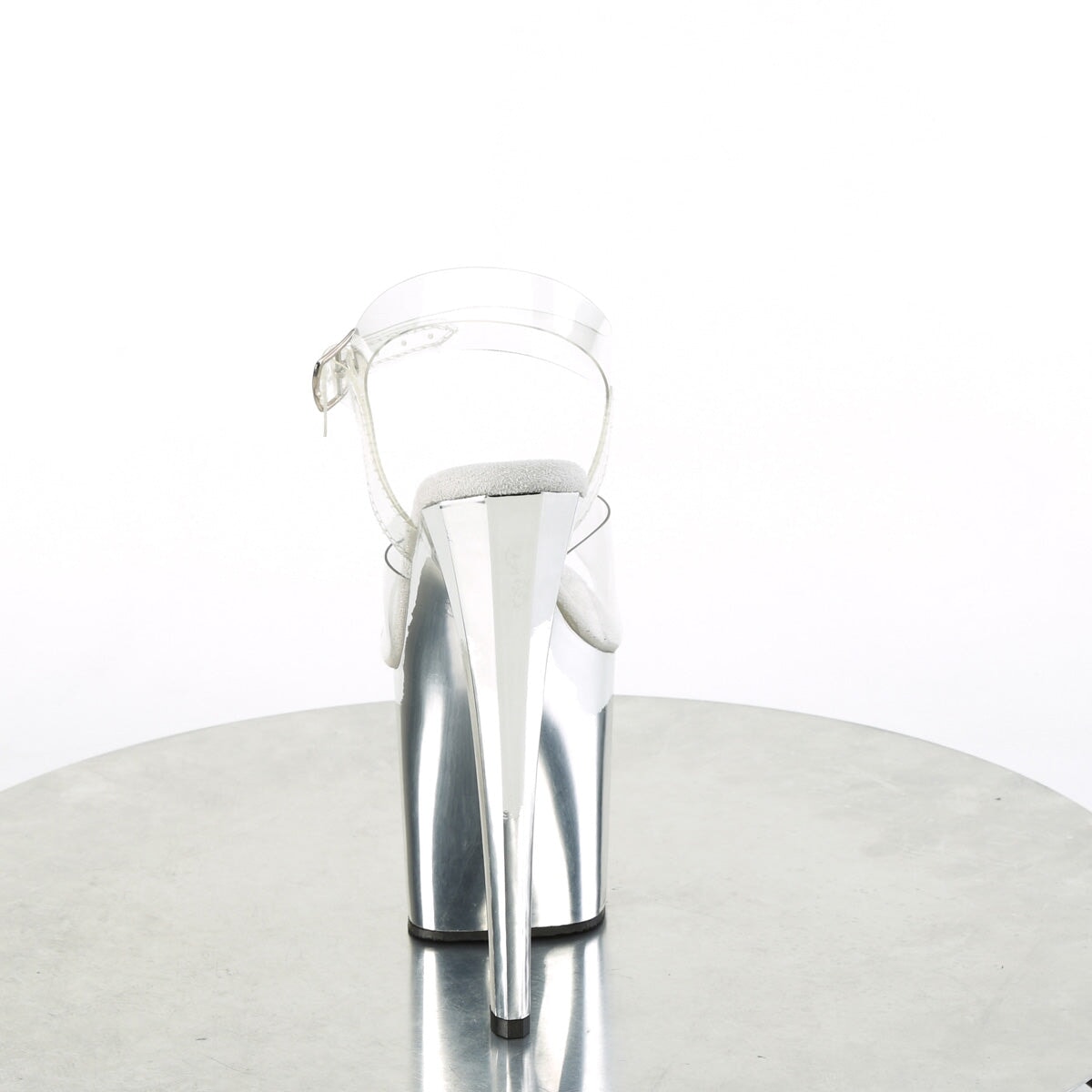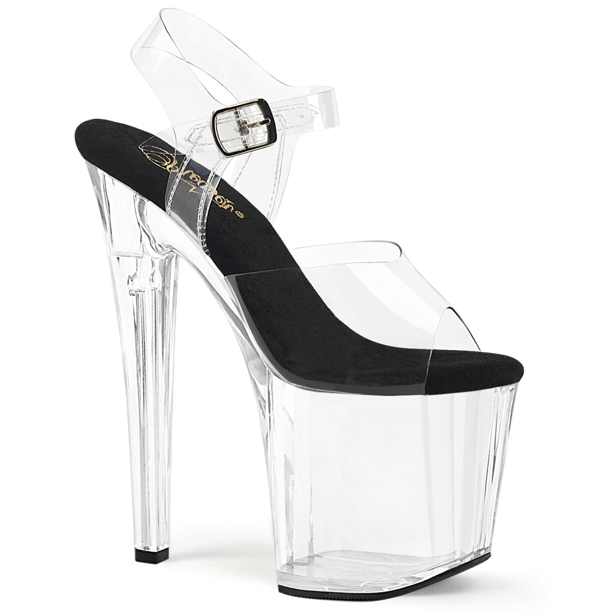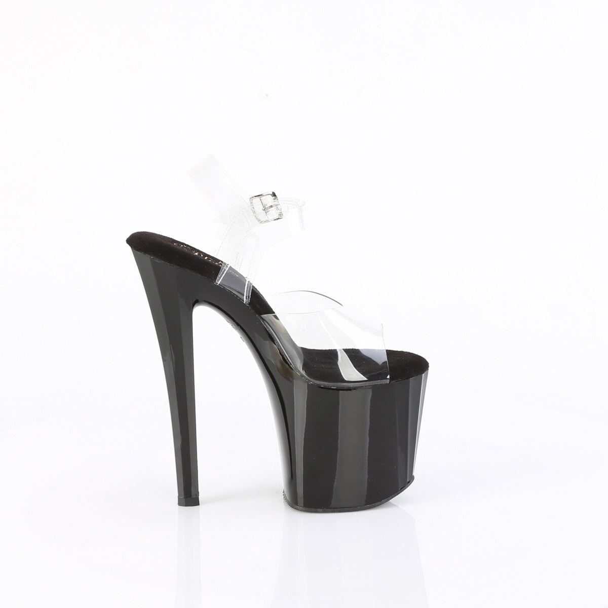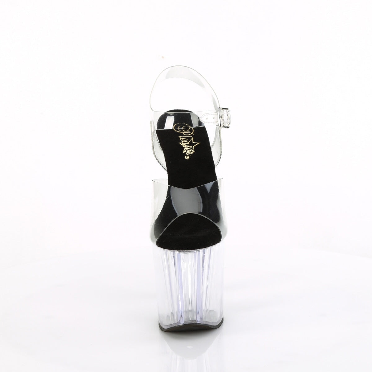 La simplicité l’emporte sur ces sandales transparentes/noires! Sandale à bride de cheville à talon de 7 1/2 po (191 mm) et à plateforme de 3 1/2 po (89 mm) avec un design linéaire prismatique à l’avant et à l’arrière du talon.