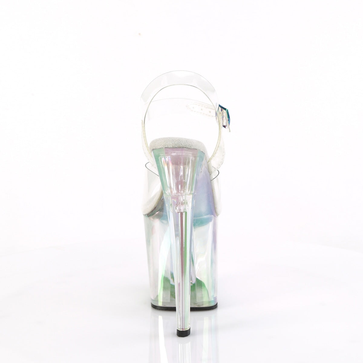 Cette sandale possède un talon de 8 » (195 mm) et une plateforme de 3 3/4 » (95 mm) avec un fond de plateforme teinté holographique. Il présente aussi un design prismatique linéaire à l’avant et à l’arrière du talon. La sangle à la cheville offre un soutien supplémentaire tandis que le design ajoute une touche unique à chaque tenue.