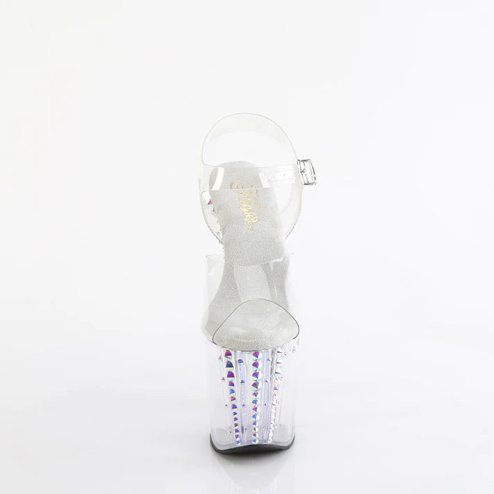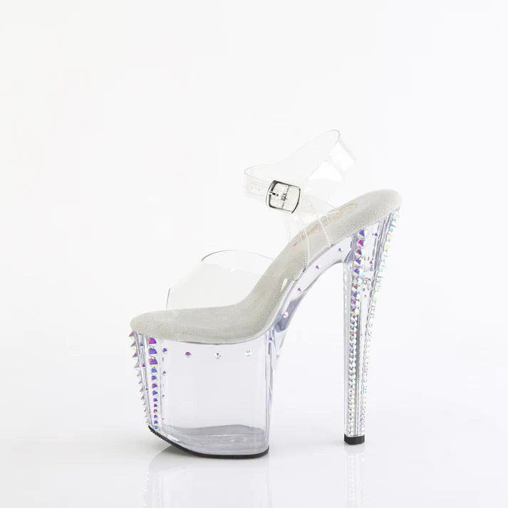 Sortez avec style avec ces talons époustouflants dotés d’un talon de 8 pouces et d’une plateforme de 3 3/4 pouces, ornés d’un design prismatique linéaire éblouissant et de clous conique en pierre de strass AB, assurant que vous brilliez à chaque pas. Parfait pour ceux qui veulent faire une déclaration glamour lors de n’importe quel événement.
