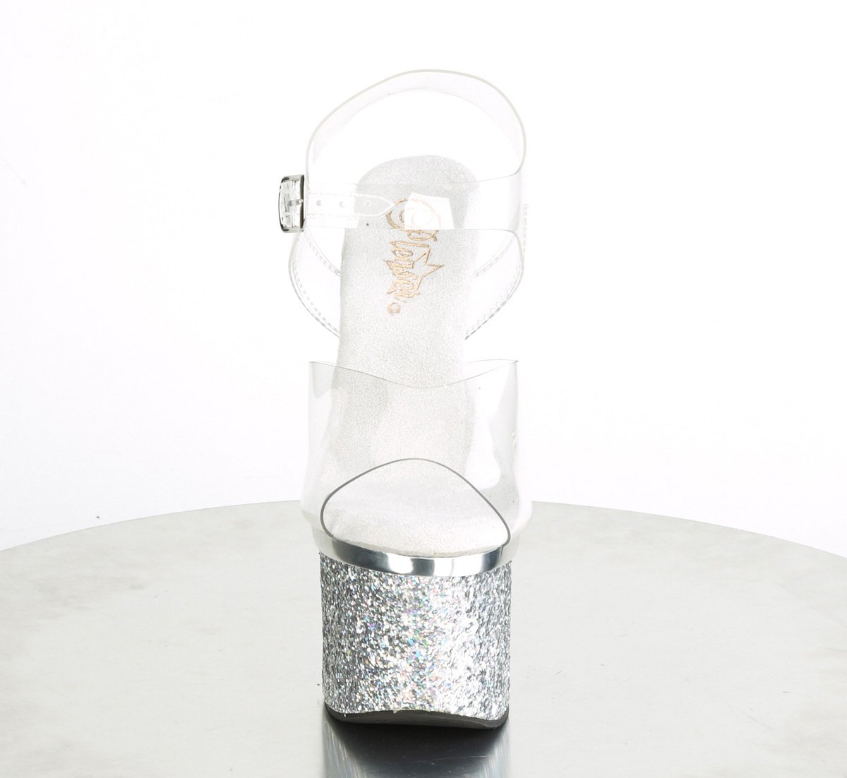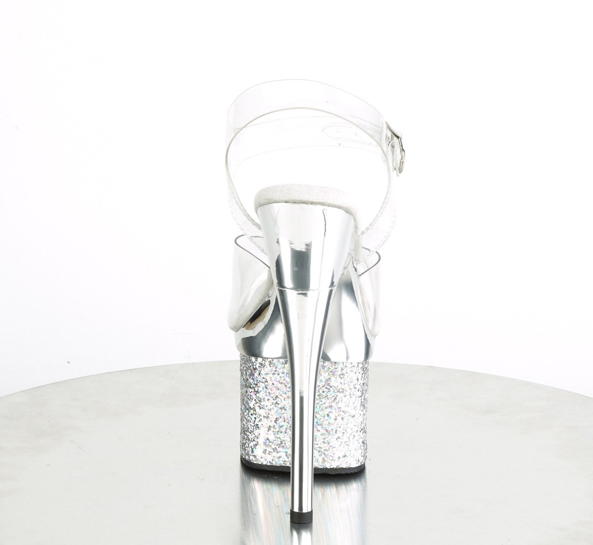 Sandale à hauteur de cheville élégante et sexy de 7 » (178 mm), sandale plateforme à bretelle à la cheville de 3 » (76 mm) avec plateforme supérieure et talon chromés ornés de paillettes holographiques couvrant la plateforme.