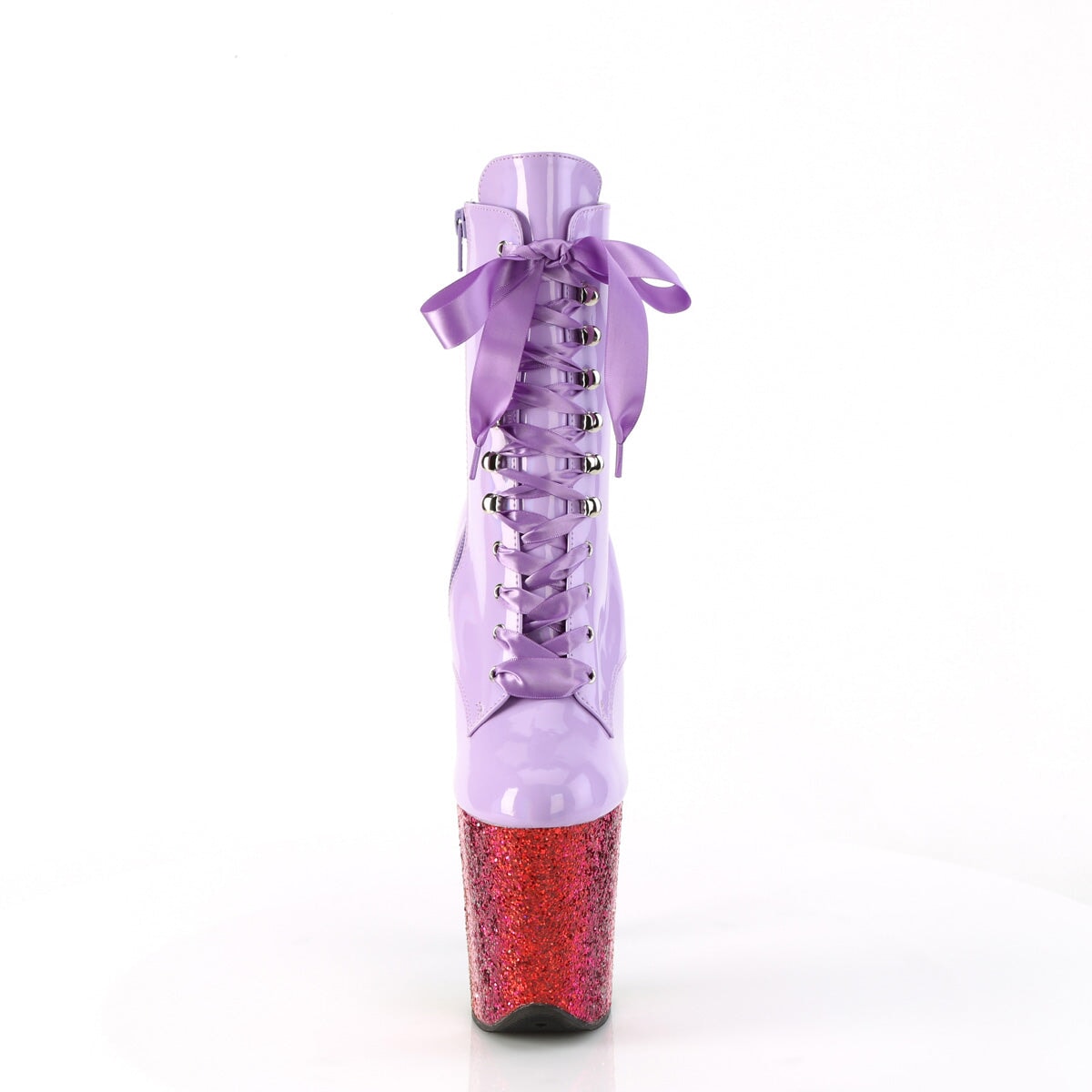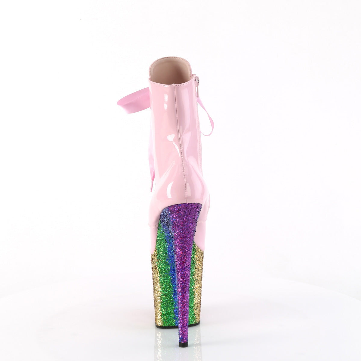 Partez à la conquête de toutes les occasions avec cette magnifique paire de bottes. Cette botte à talon de 8 po (200 mm) et à plateforme de 4 po (100 mm) à l’avant avec un fond plateforme à paillettes arc-en-ciel et une fermeture à glissière intérieure. Comprend un ruban dentelle.