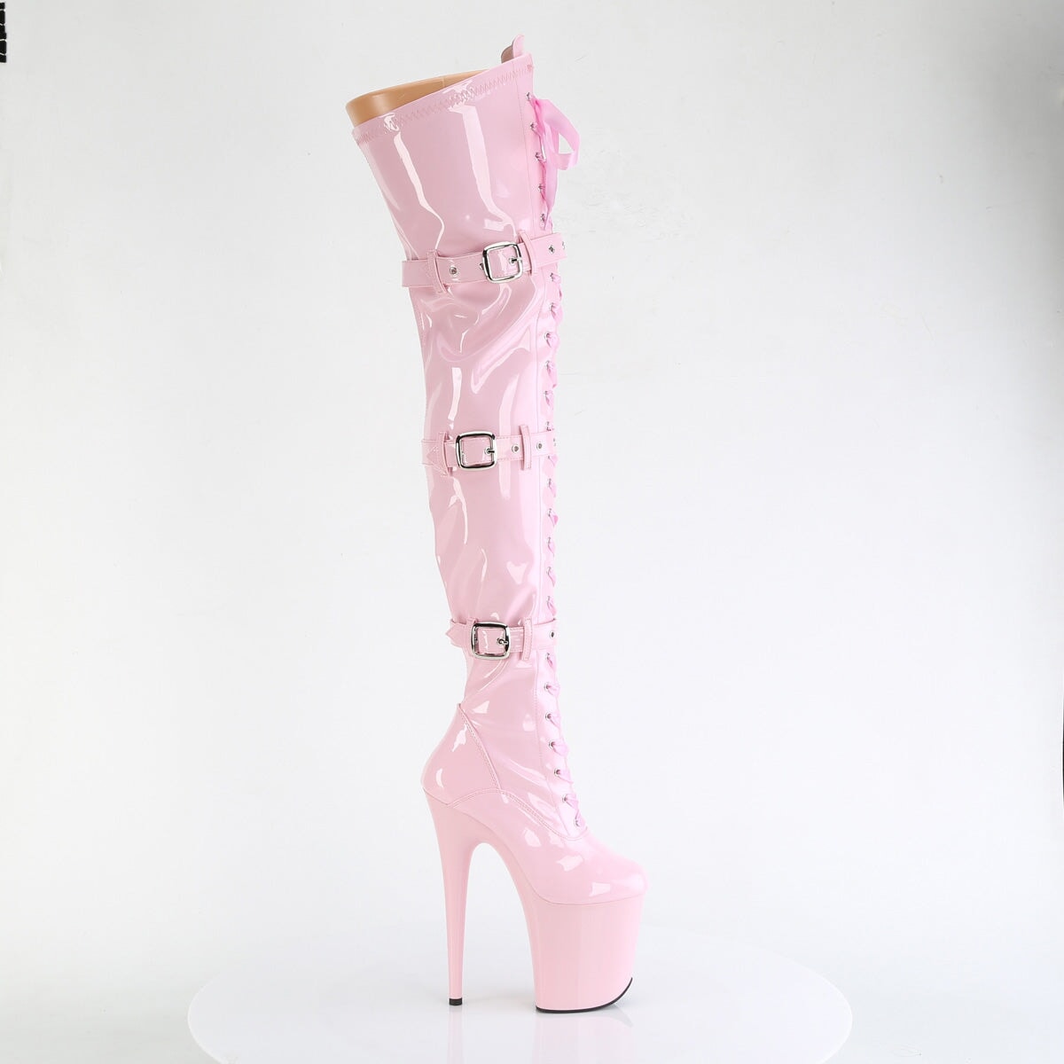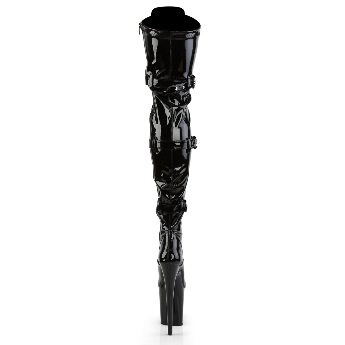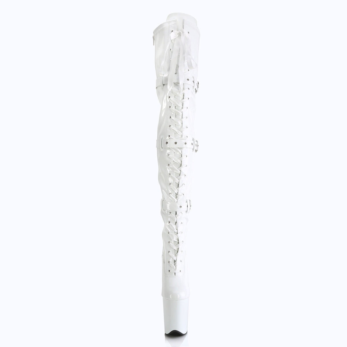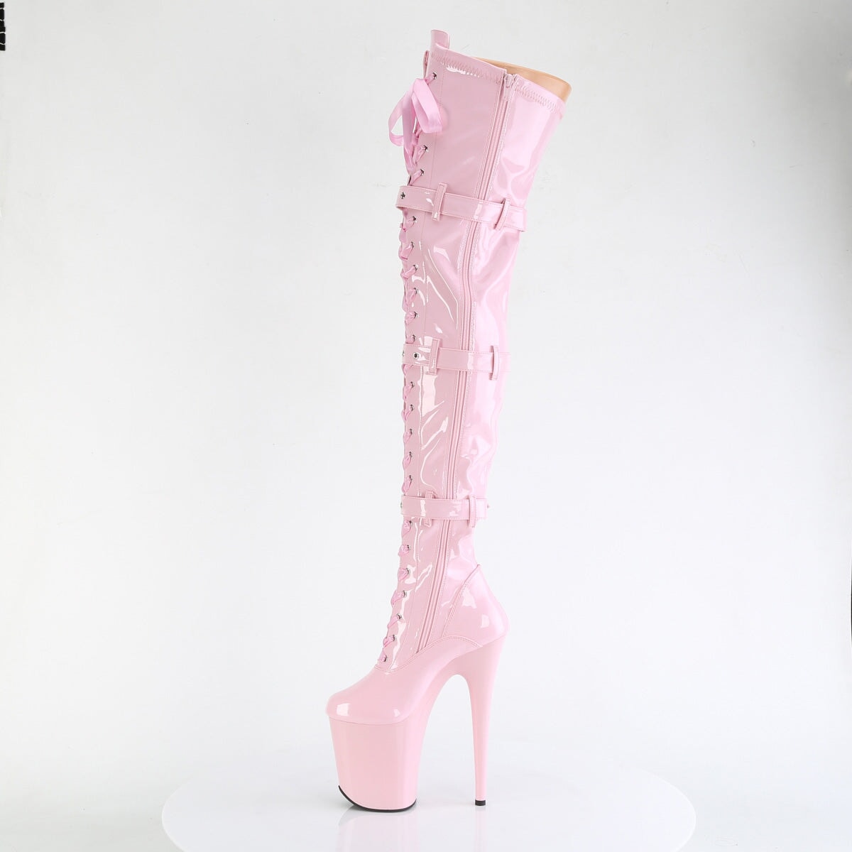Botte à talon avant-gardiste de 8 po (20 cm), à plateforme de 4 po (10 cm) avec cuisse extensible à l’avant avec bretelles sexy et détail de boucle de ceinture. La fermeture à glissière intérieure pleine longueur vous permet d’enfiler et d’enlever facilement ces cuissardes.