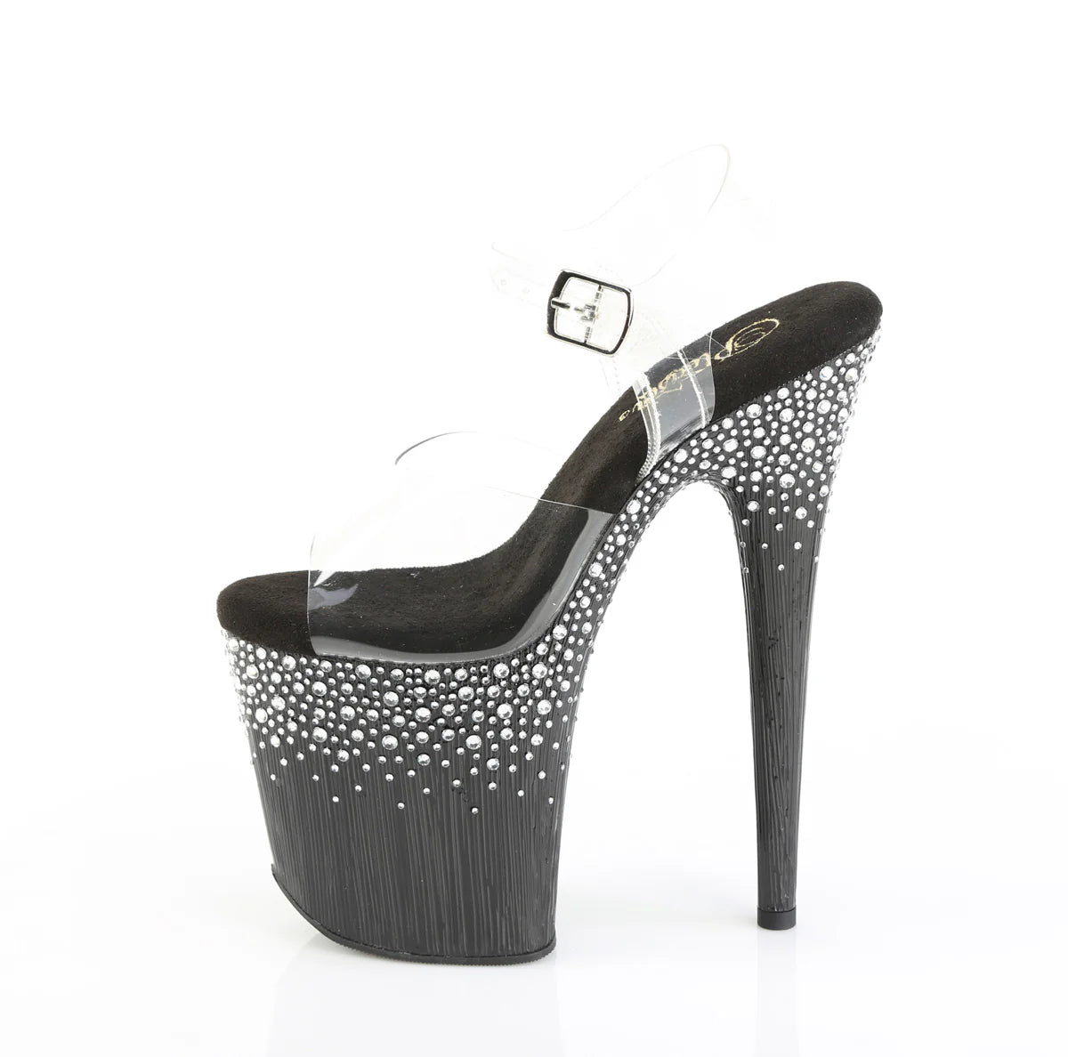 This 8" (100mm) heel, 4" (200mm) platform ankle strap sandal features a sprinkle rhinestone design on the upper half of the platform bottom & Hee.