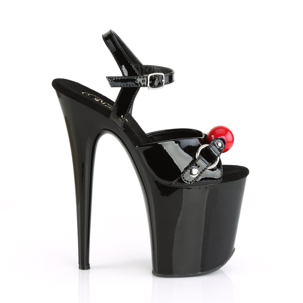Montrez-leur qui est le patron dans ces sandales audacieuses et sexy à talons de 8" (200 mm), 4 pouces (100 mm) à bandes plateformes à la cheville, avec des boules de bâillon interchangeables (Rouge et Fuchsia) sur le vamp.