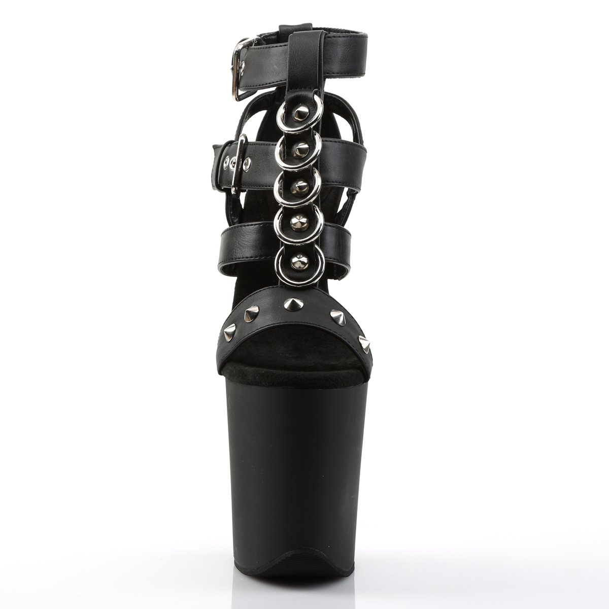 Sandale plateforme, bride en T, dos fermé, avec anneaux métalliques et détails de clous. L’amorti doux contribue, avec la plateforme avant de 4 pouces, à créer une sensation confortable pour les pieds, tandis que les talons hauts de 8 pouces ajoutent une touche provocante pour un look sexy sans aucun sacrifice.