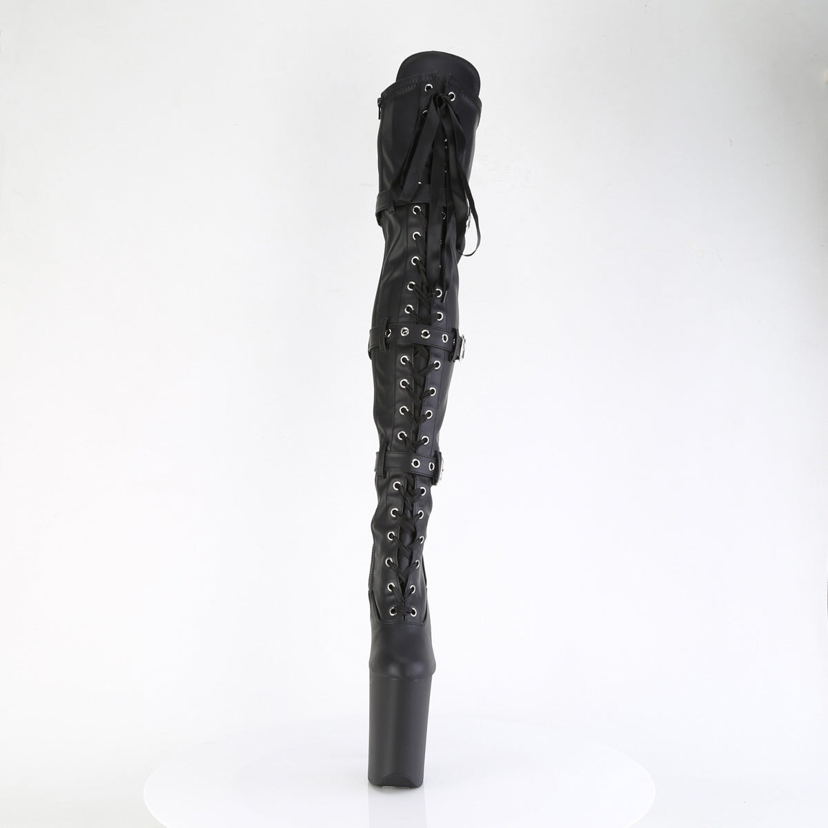Incarnez votre côté sombre avec ces bottes à talons de 9 pouces (22,9 cm), 5 1/4" (13,3 cm) à plateforme à lacets extensibles à lacets, montant montant à l’avant, avec des sangles à triple boucle, ainsi qu’une fermeture éclair intérieure pleine longueur pour un port facile à porter.