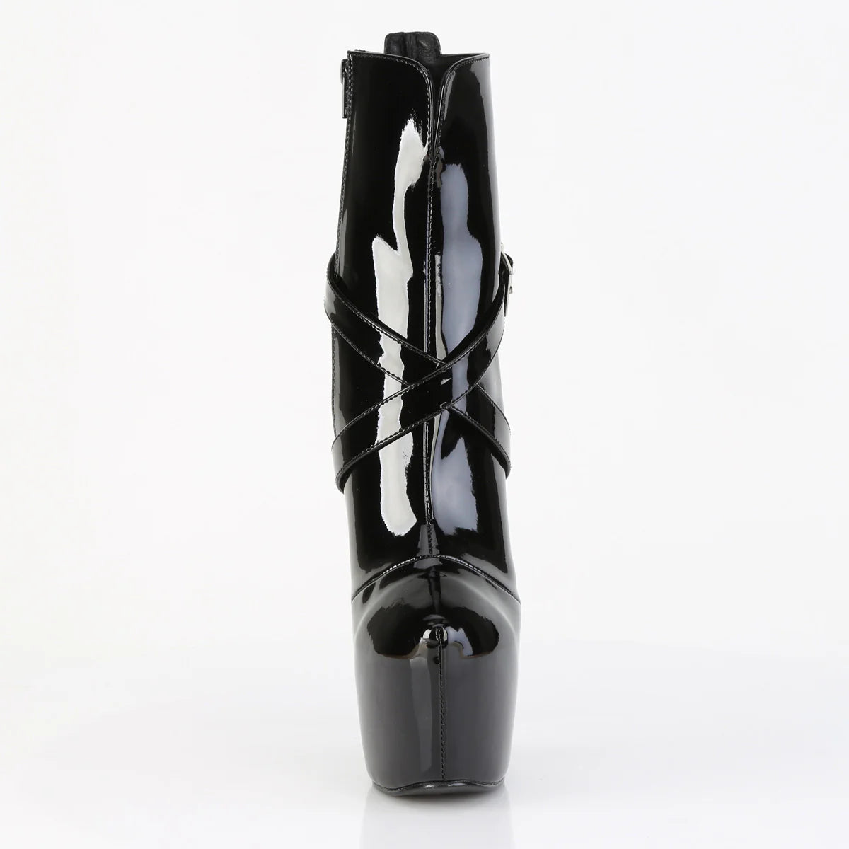 Cette bottine est équipée d’un talon aiguillet de 7 » et d’une plateforme dissimulée de 3 » pour un look élégant et stylé. Il possède aussi une sangle croisée amovible, un détail de boucle et une fermeture éclair latérale intérieure, avec une hauteur de tige d’environ 6 pouces.