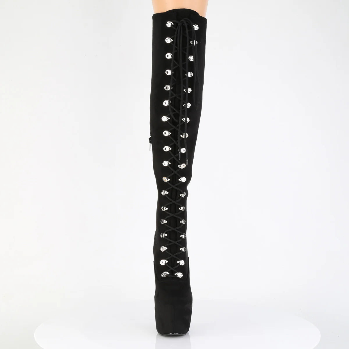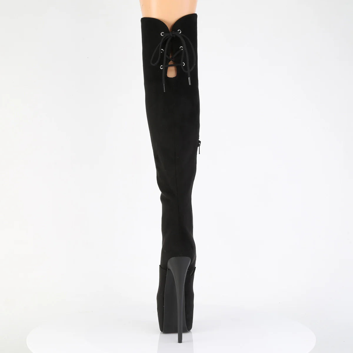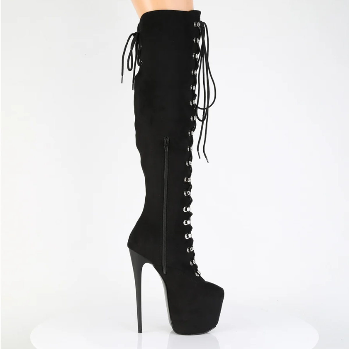 Cette botte élégante au-dessus du genou possède un talon aiguille de 7 », une plateforme dissimulée de 3 », un avant lacé avec crochets rapides, ainsi qu’une fente arrière et fermeture éclair latérale intérieure. Le manche mesure environ 19 pouces, offrant un look audacieux et élégant.