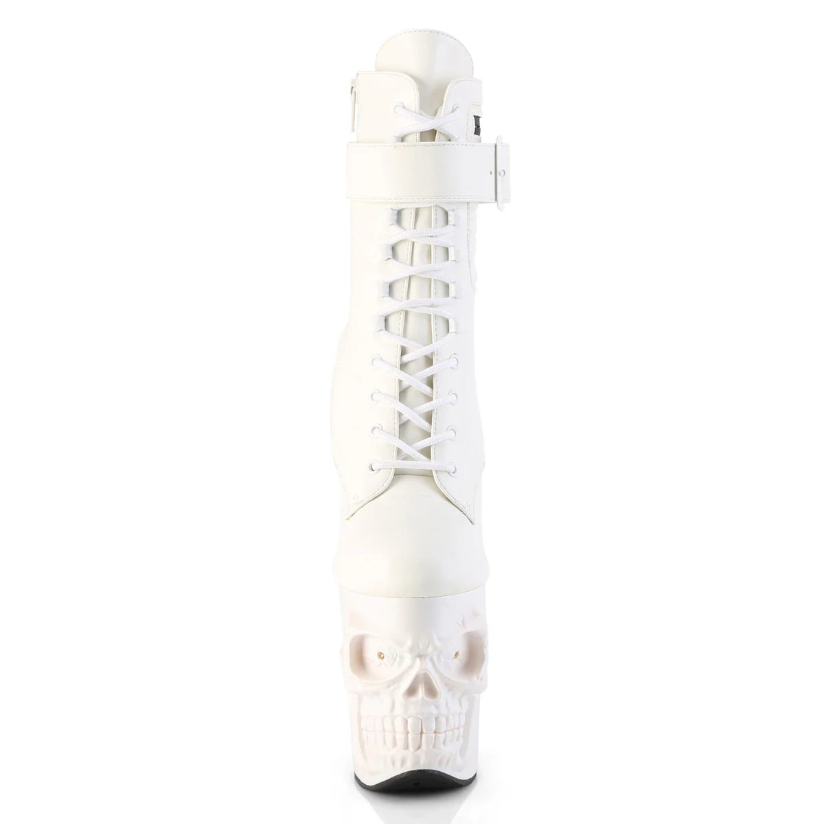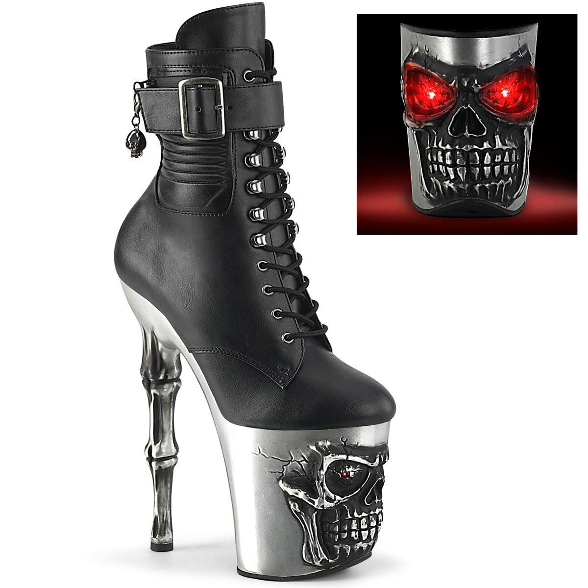 Osez porter cette botte à dents à dents sculptée de 4 » (100 mm) avec un talon d’os de doigt de 8 » (200 mm) et une botte à dentelle à dentelle sculptée de 4 » (100 mm) avec des lumières LED rouges rechargeables par USB avec de multiples motifs statiques / changeants dans les yeux du crâne et à l’arrière du talon, une poche extérieure à fermeture à glissière et des mini breloques de crâne, une fermeture à glissière latérale intérieure.