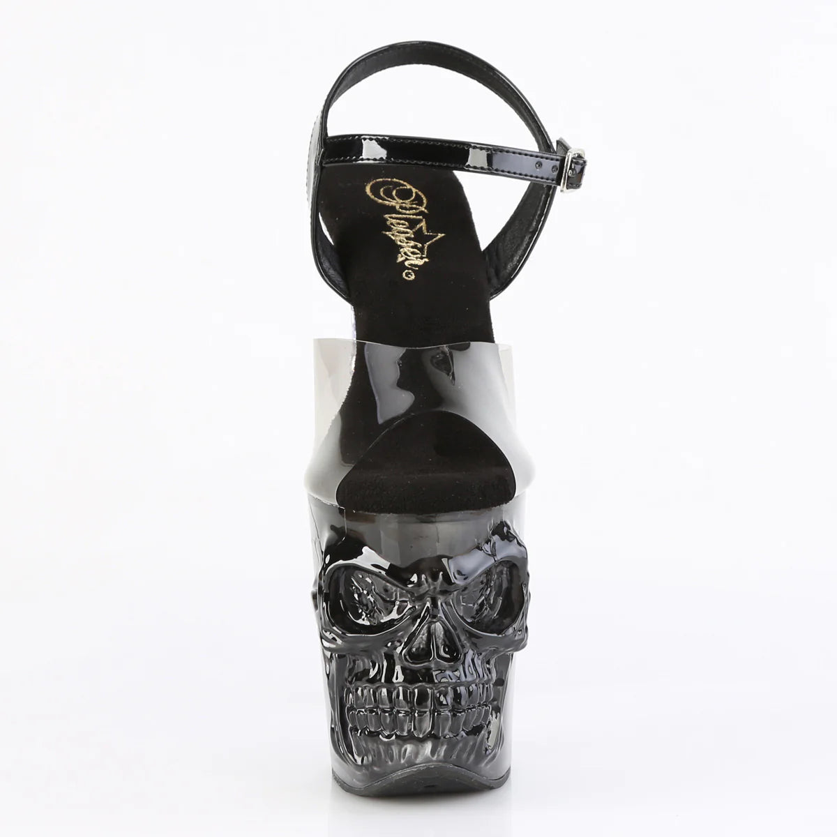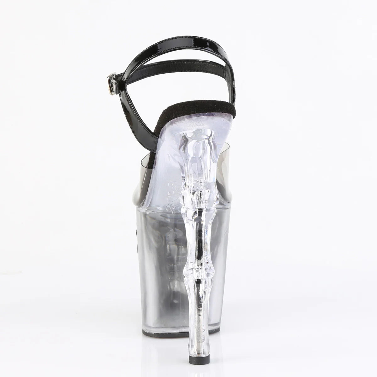 Cette lanière audacieuse à la cheville présente un talon en os de doigt impressionnant de 8 pouces et une plateforme de 4 pouces, faisant une déclaration frappante. Le bas à plateforme ombré transparent et noir, orné d’un crâne et d’os, ajoute une touche unique à votre collection de chaussures.