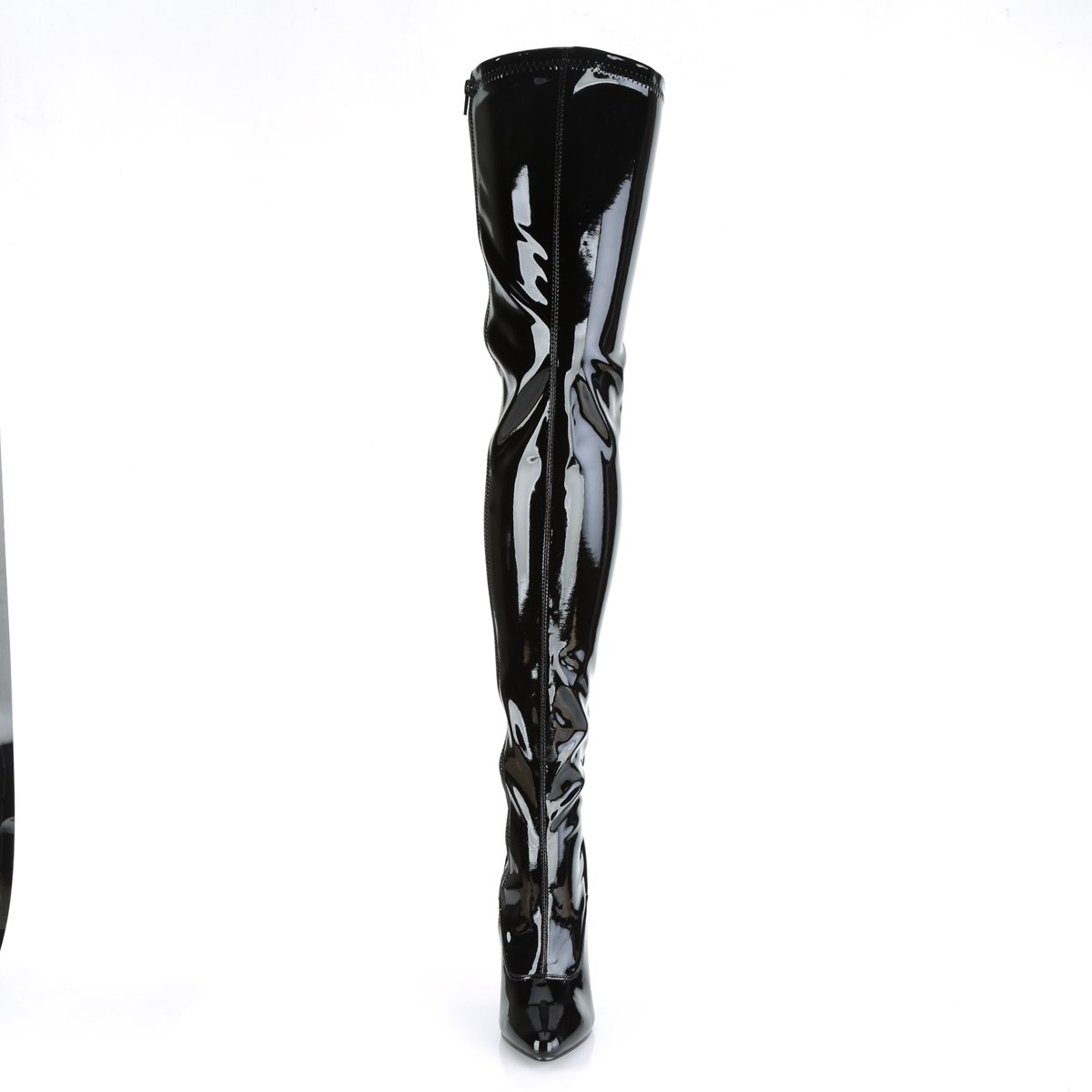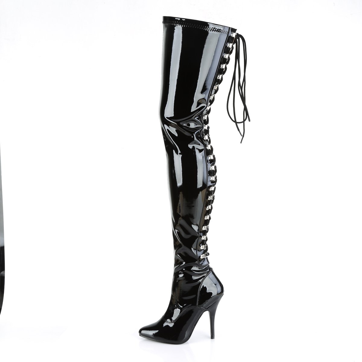 Bottes noires flatteuses sur les jambes, longues jusqu’à la cuisse et détails dramatiques à lacets, peau exposée et anneaux métalliques en D fixés sur les côtés. La fermeture éclair pleine grandeur est positionnée à l’intérieur pour permettre un enfilage confortable, tandis que les talons hauts de 5 pouces (12,5 cm) sculptent les jambes pour un look impressionnant.
